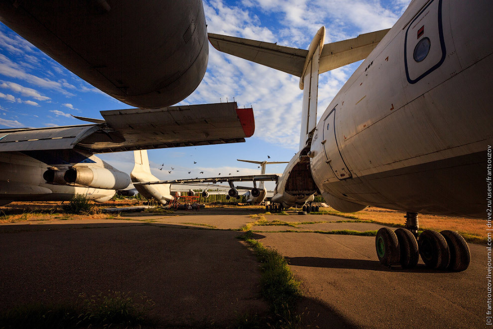 На огромной бетонной площадке позади аэропорта стоят 15 самолётов Ил-76.