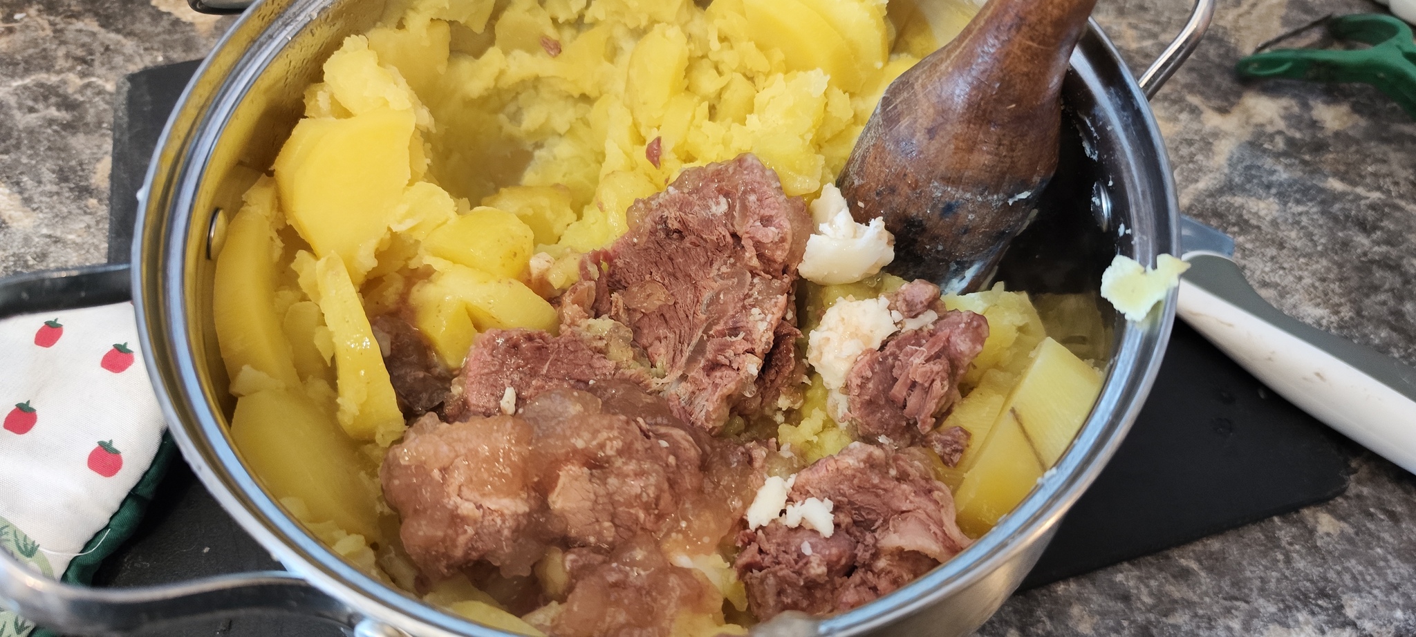 Сливаем отвар, как только картошка легко стала протыкаться колющими режущими предметами. Не на себя, а в раковину. Добавляем молока и немного разминаем. Не сильно. Затем разделываем тушёнку в блюде и добавляем к нашему картофелю.