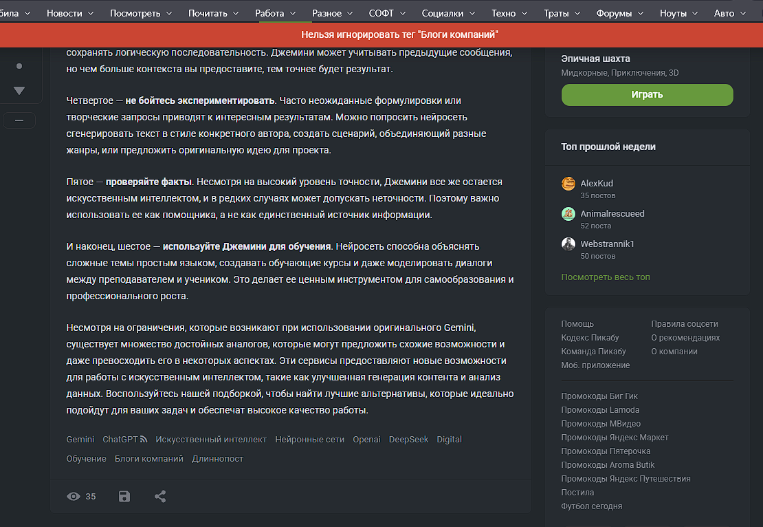 1 DS26RUS 15 часов назад Классно пикабу вы придумали Оказывается, нельзя в игнор кинуть тег "Блоги компаний", надо скрывать посты ТС-а только, если не хочешь эту "неочевидную" рекламу наблюдать. Посты на Пикабу Теги Реклама Ещё 0