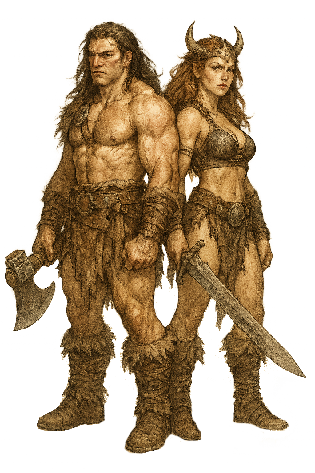Оружие: Варвары обычно носят с собой крупные, мощные виды оружия: топоры, мечи, дубины, копья. Часто их оружие украшено примитивными символами или трофеями.