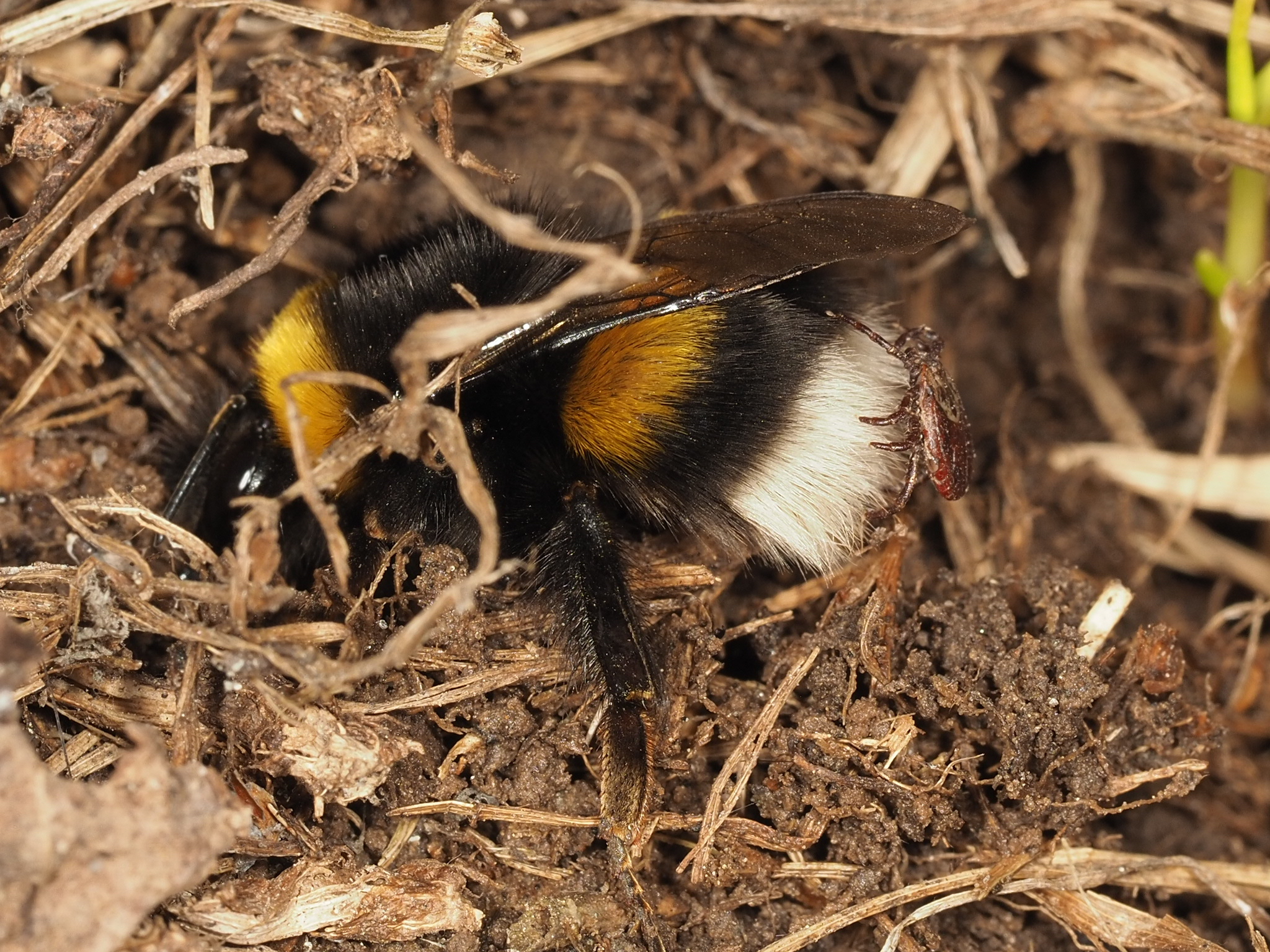 Шмель копался в земле, видимо строил гнездо, к нему подкрался клещ(луговой, по моему) и напал на бедолагу, не удержался, слетел, но снова попытался забраться на шмеля.. Это частое явление? Такая ошибка частое явление?