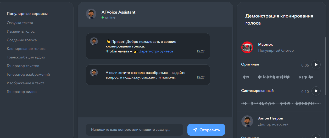 По голосу тут есть озвучивание текста и голосовой ввод/голосовое общение, то есть можно и говорить, и получать ответ, и при необходимости превращать текст в аудио. Я бы использовал его так: вы быстро пишете/правите сценарий в чате и тут же делаете черновую озвучку, не прыгяя между десятью вкладками. Но если вам нужен именно клон голоса или тонкая режиссура интонаций — это не его сильная сторона.