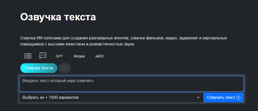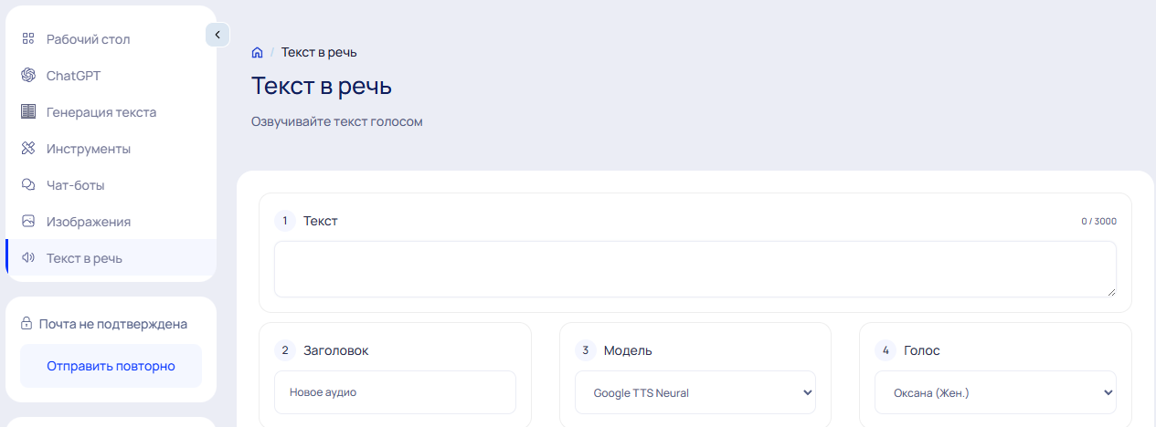 Вы генерируете речь за кредиты, и на тарифах сразу прописывают, на сколько минут озвучки их примерно хватит. Я бы использовал GPT-Tools, когда вам нужно быстро сделать озвучку для учебных/рабочих задач и параллельно допилить текст там же, в одном сервисе.