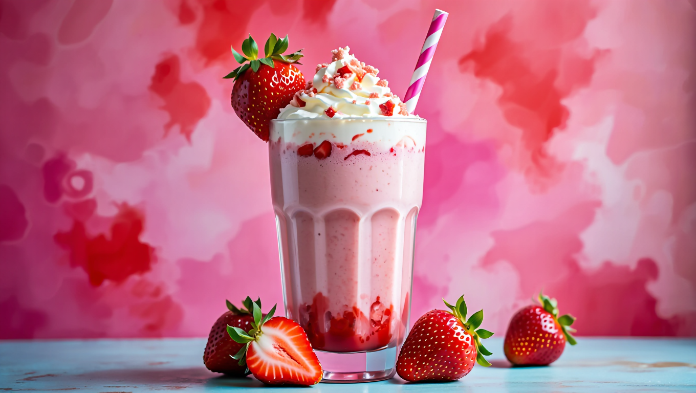 Промпт: A luxurious strawberry milkshake photographed in a classic tall glass against a watercolor-style pink and red background. The milkshake features a gradient effect from deep red at the bottom to creamy white, topped with a generous swirl of whipped cream decorated with strawberry crumbles and a pink striped straw. Fresh, ripe strawberries with vibrant green leaves are arranged around the glass and as garnish, with some cut to display their internal flesh. The image employs professional food photography techniques with front lighting, shallow depth of field, and careful attention to texture and reflection details. Professional food photography with front lighting and shallow depth of field against a soft background.