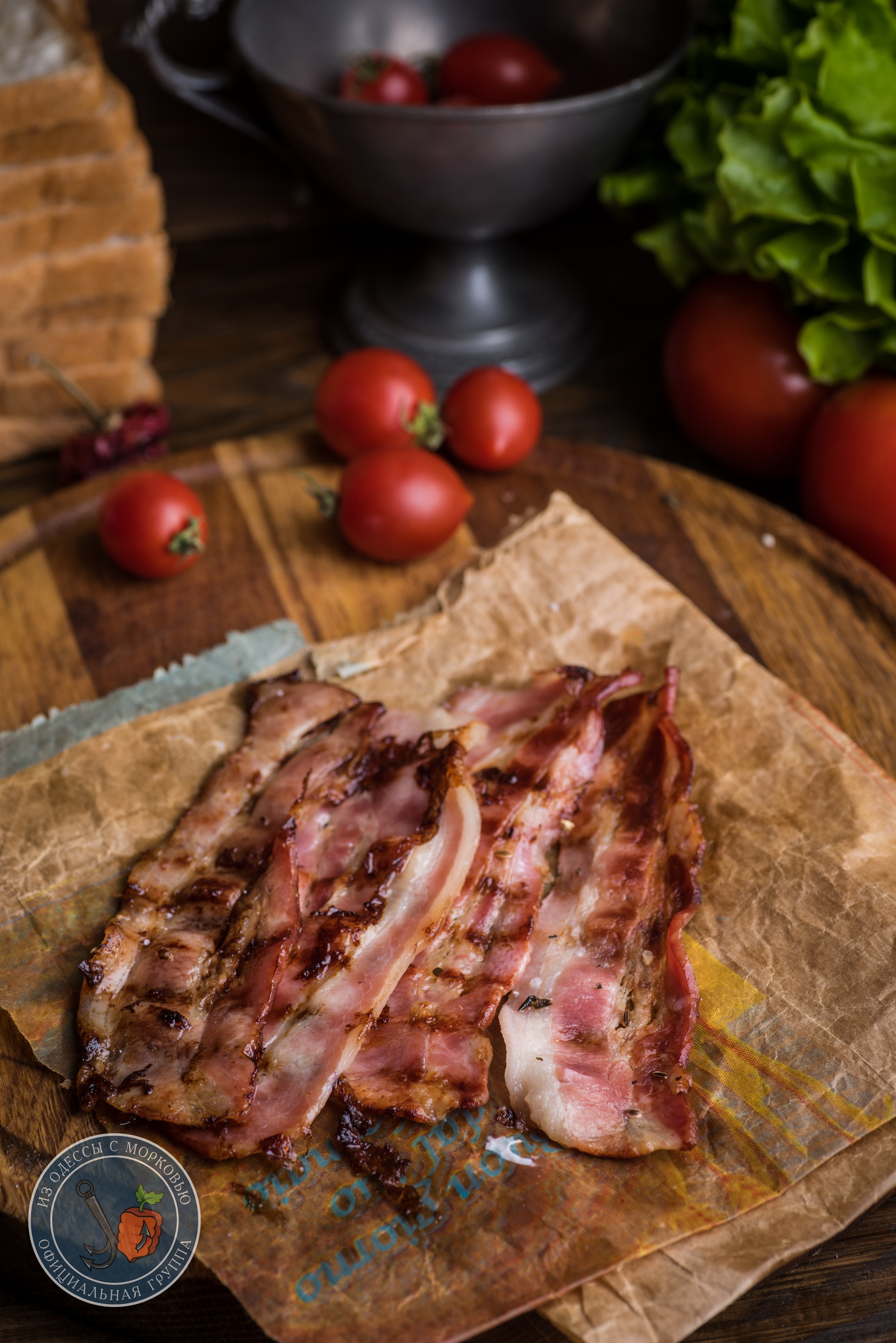 - В сухой сковороде обжарить до хрустящего состояний бекон, затем его убрать и сложив один на другой, порезать пополам.