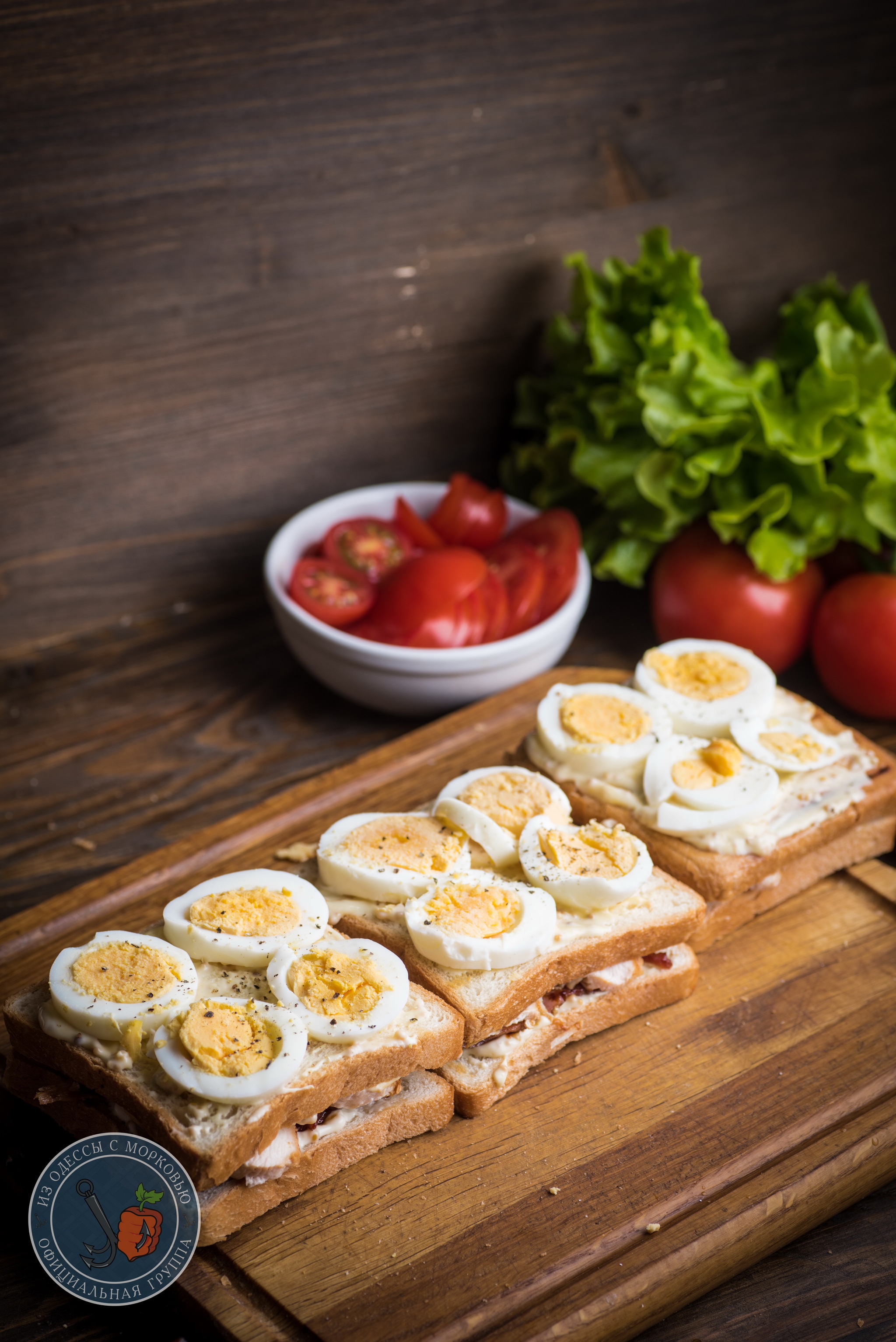Выводы:классный, красивый и гармоничный сэндвич. Вкусный и ни к чему не обязывающий. В руках не разваливается и укоризненно на вас не смотрит. Классический такой бутер, проверенный временем. Хоть к кофе, хоть к пиву. Можно смело рекомендовать к приготовлению.