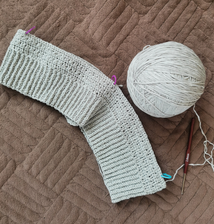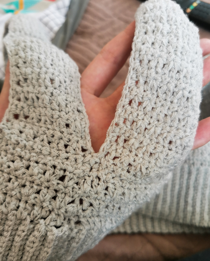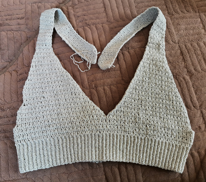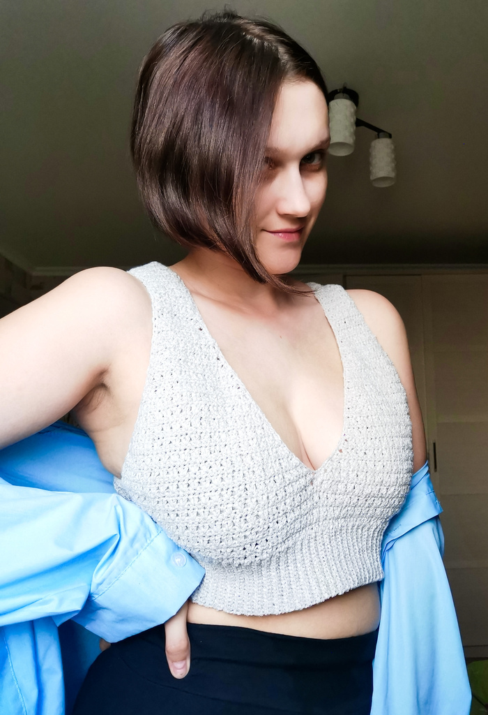 И вот спустя четыре дня, спустя литр пота, (у нас жарко, днем было 35°С, да и вообще вязание тот ещё труд) топ готов!