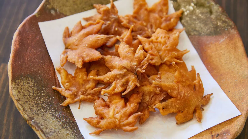 Технология не для нетерпеливых. Листья собирают вручную — только жёлтые, с мягкими прожилками, от специального сорта «итигёкаэдэ». Затем их солят и выдерживают год. Потом промывают, обмакивают в сладкое кляр с кунжутом и жарят двадцать минут. Результат — хрустящие, похожие на карамель пластинки, сохранившие форму пятипалого листа.