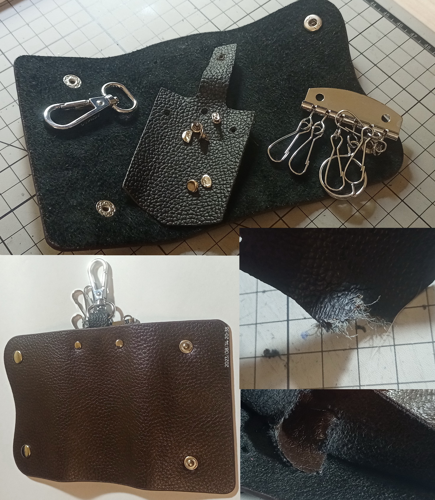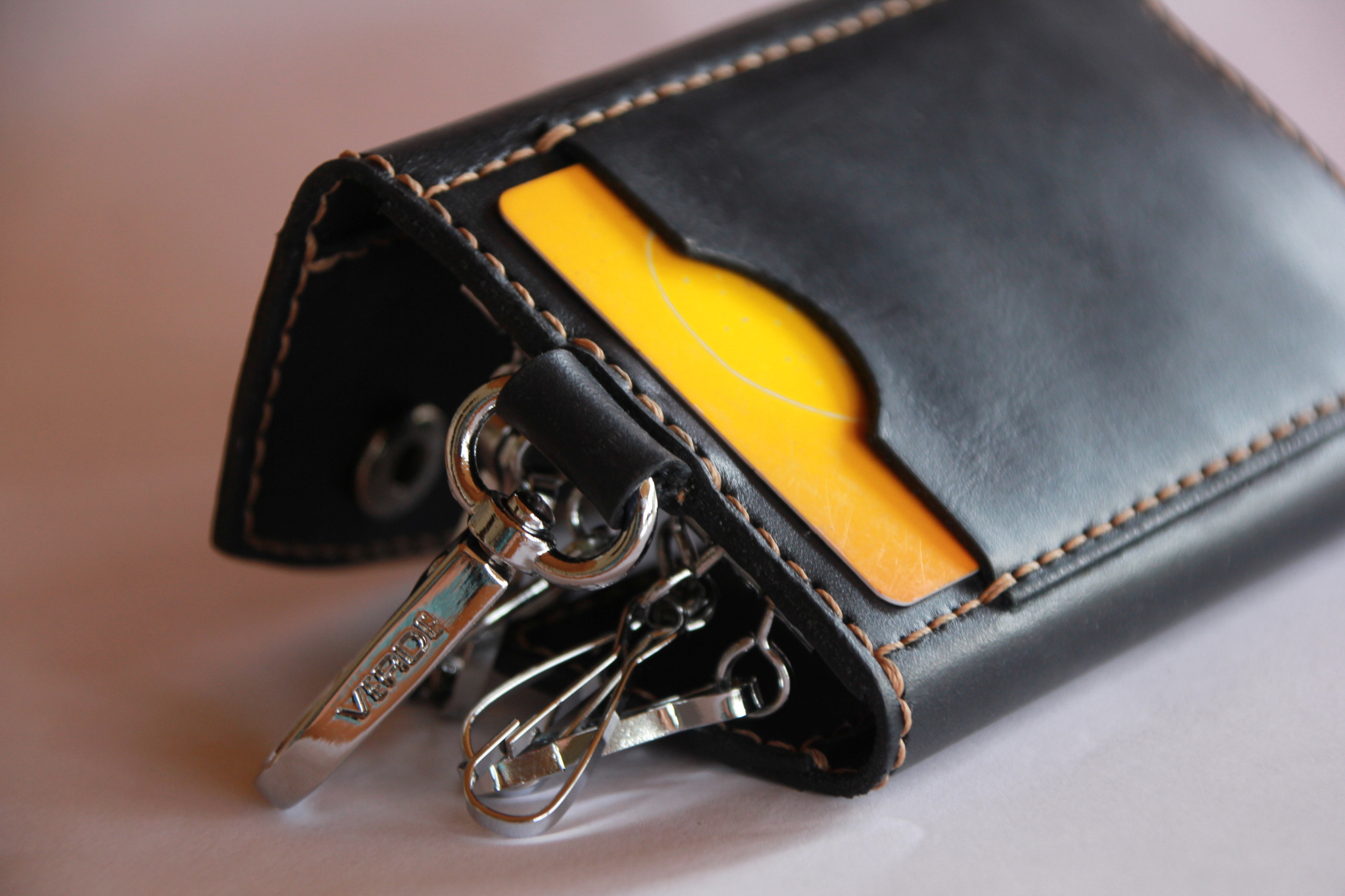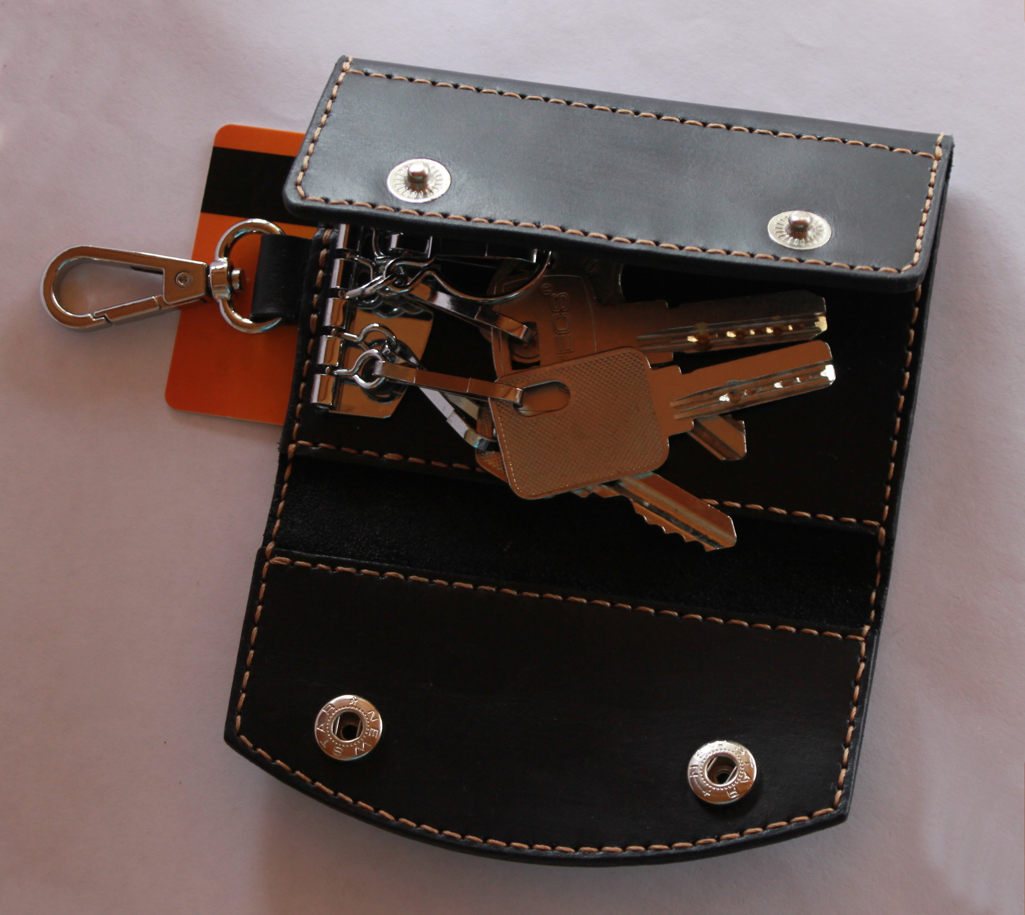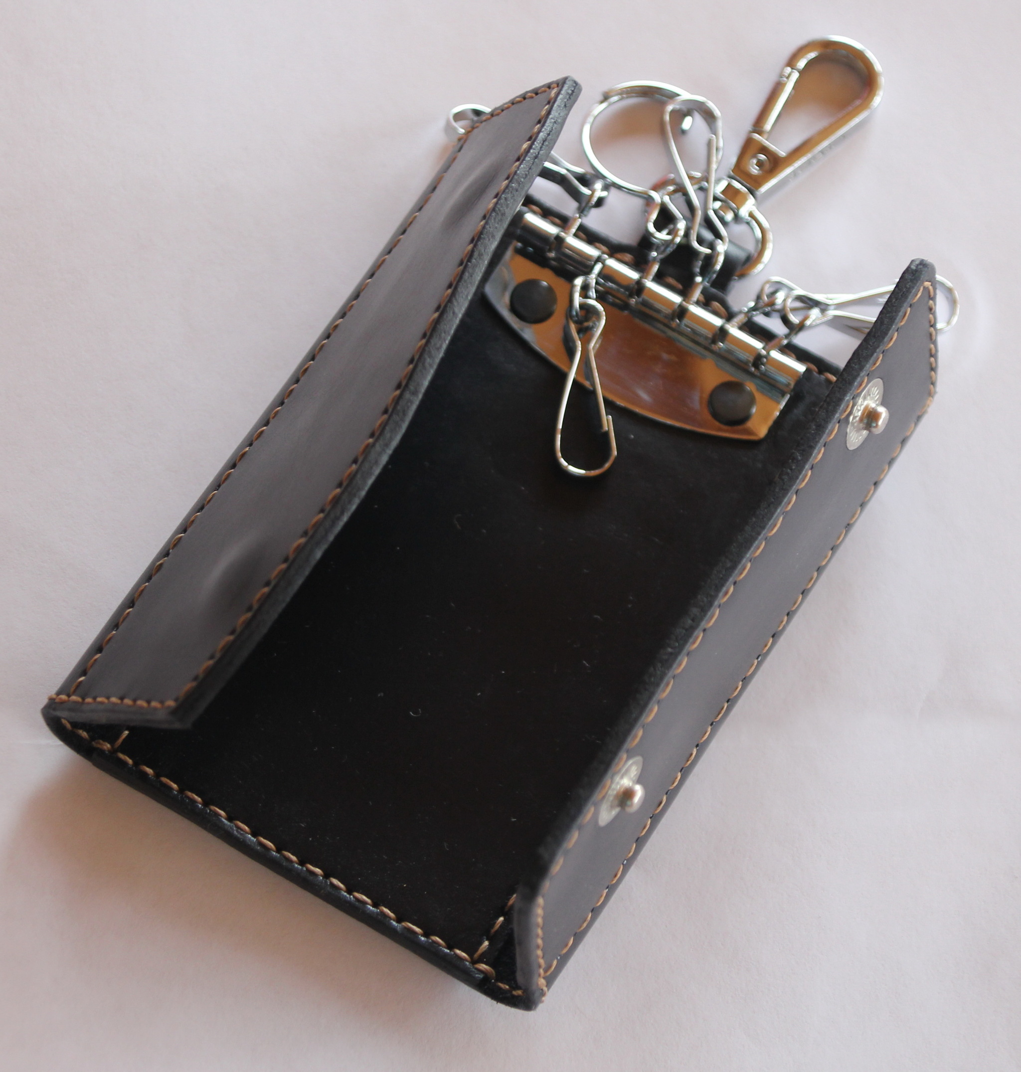 Даже не знаю, на сколько эта штука функциональна и пользуются ли ей вообще. Но в руки мне попала вот такая ключница. Когда подержал в руках натуральный материал, то на вещи, которые имитируют кожу, смотришь со скептицизмом. В данном случае я посчитал кощунством использование фурнитуры с таким материалом.