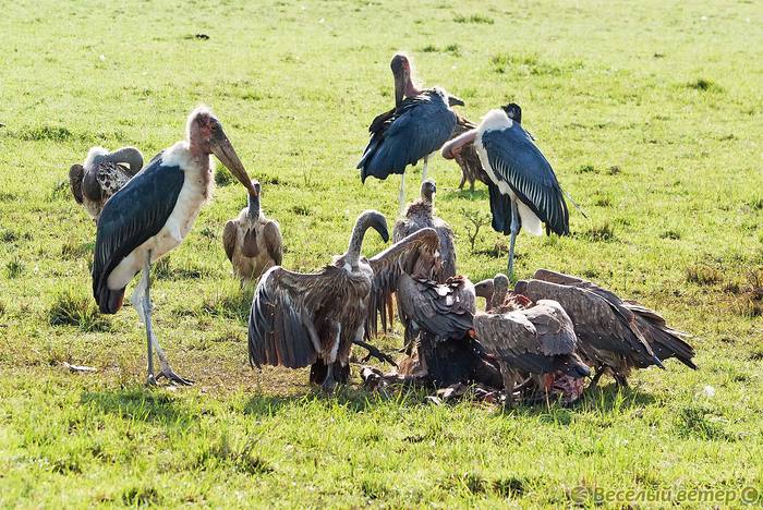 Как не трудно догадаться эти ребята закоренелые падальщики, хотя и охотой тоже не пренебрегают. Совместно с грифами, марабу это последнее звено обгладывания мертвой тушки. Также марабу не ссут отнимать добычу и других птиц, а иногда им удается и гиенам дать пизды, чтобы с гордостью завладеть лишним куском мяса.