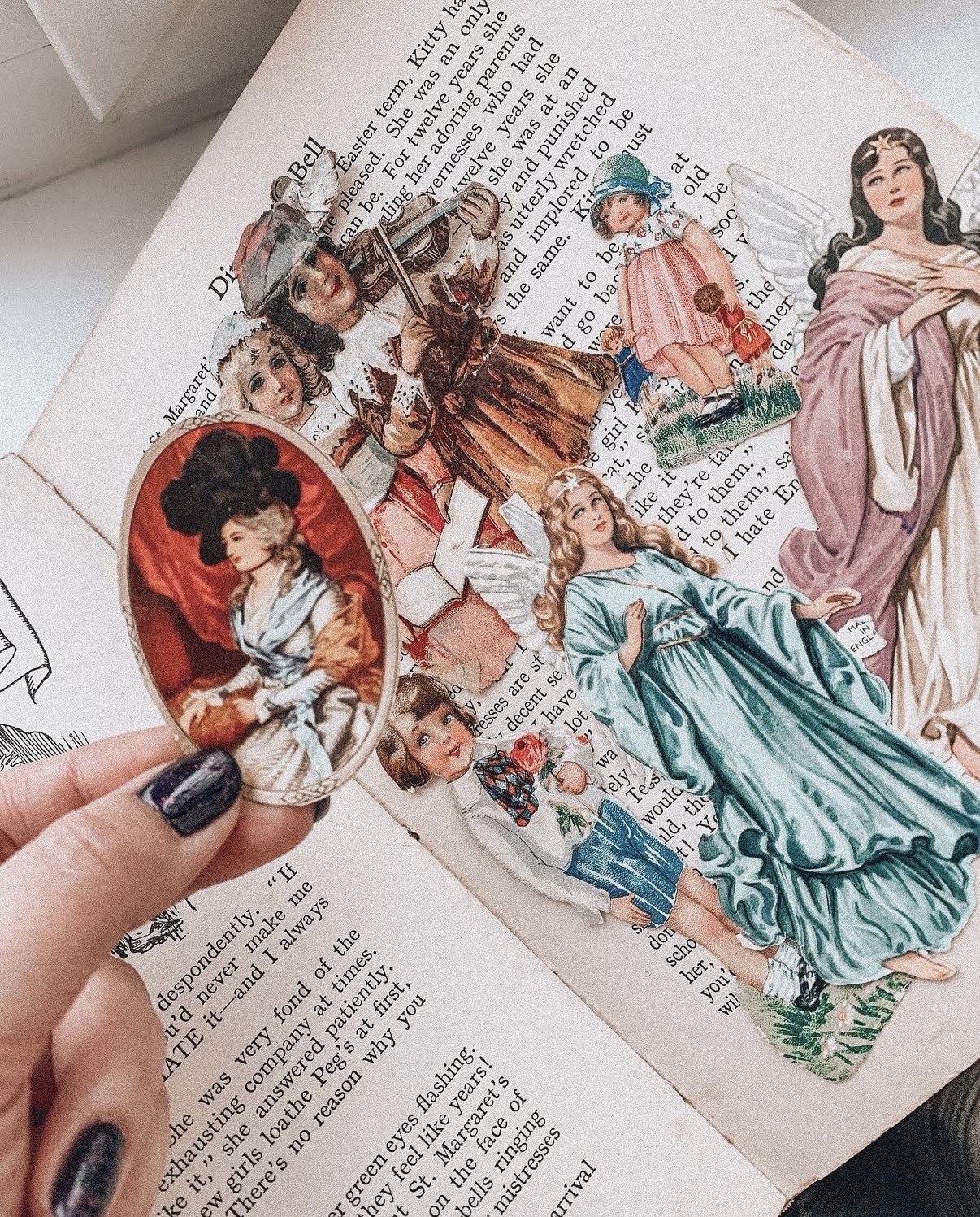Видимо, девчушка не только любила читать эту книгу, но и сделала её хранилищем для «девичьих сокровищ»: листая страницы, можно увидеть с сотню красивейших винтажных картинок-вырезок из журналов, упаковок, обёрток конфет... Всё это богатство сохранилось и живо до сих пор, я аккуратно продолжаю беречь чьё-то детство. Есть идея сделать из нескольких вырезок винтажные ёлочные игрушки.
