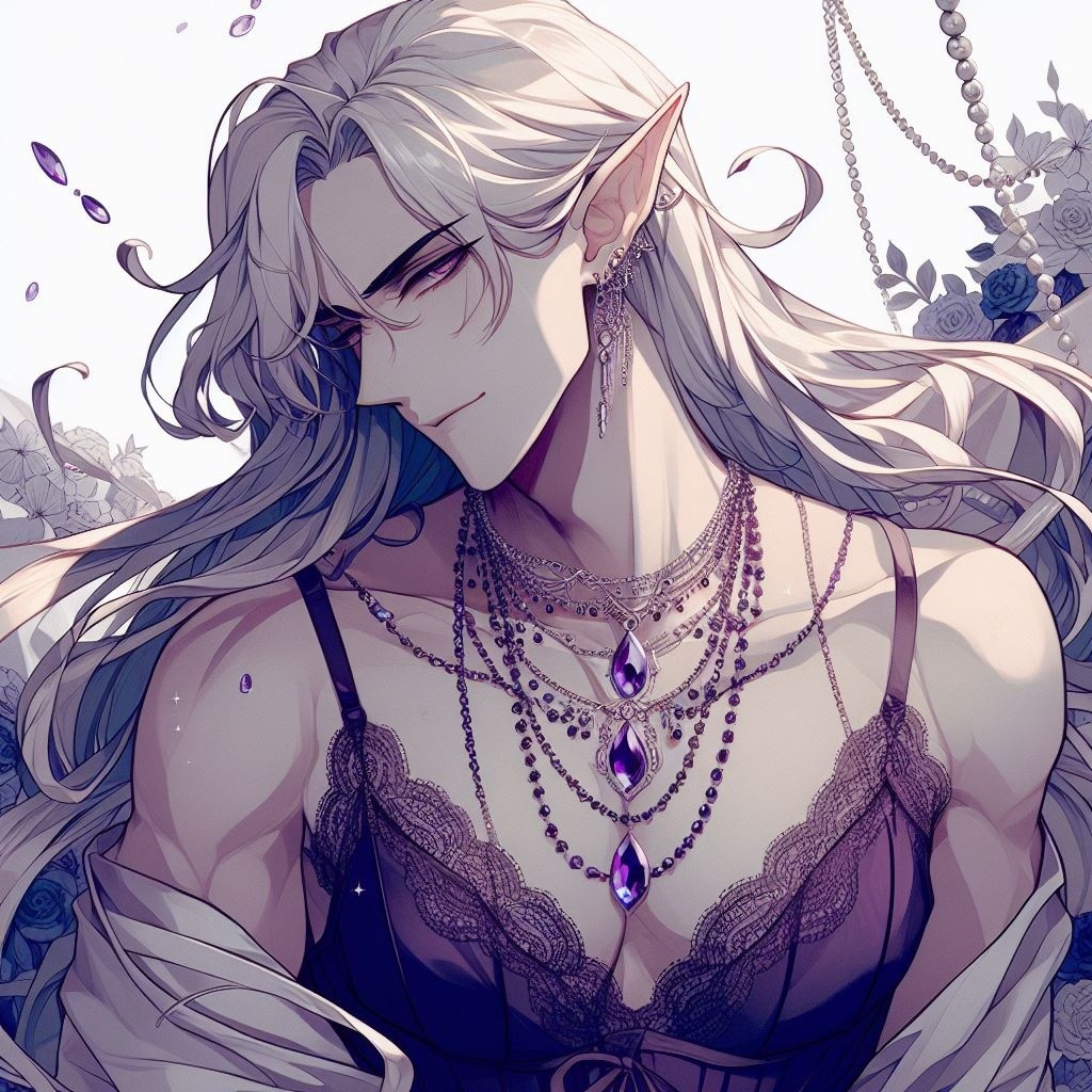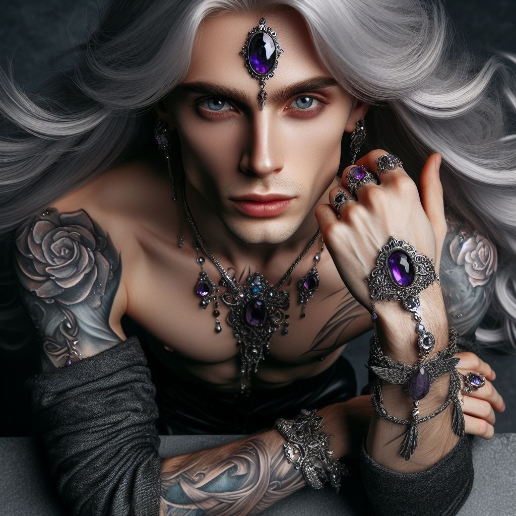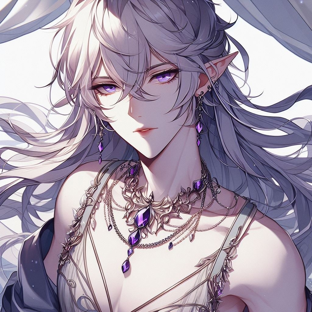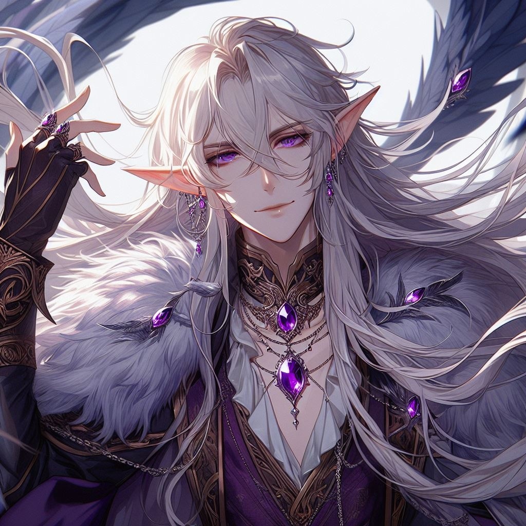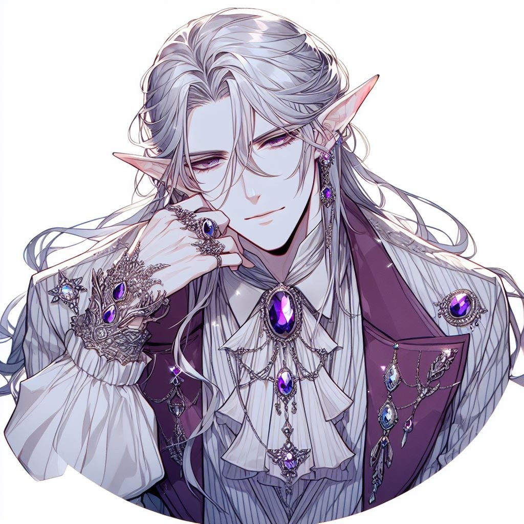 парень, эльф, серебристые длинные волосы, бледная кожа, роскошный камзол, украшения, аметисты, ракурс сверху
