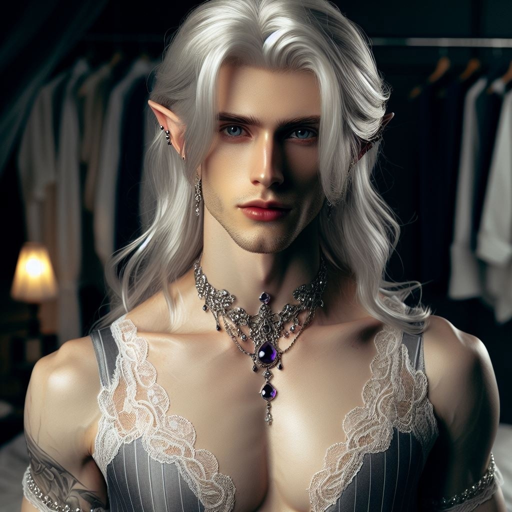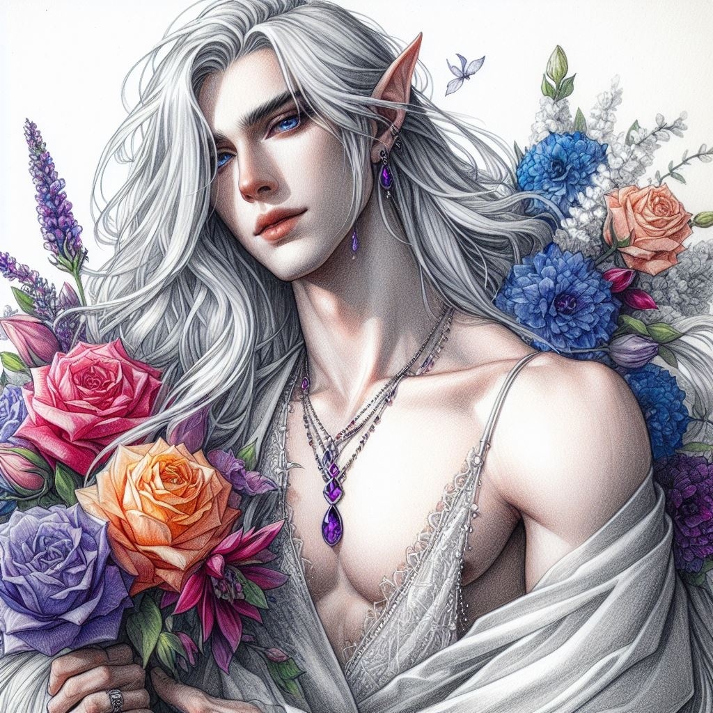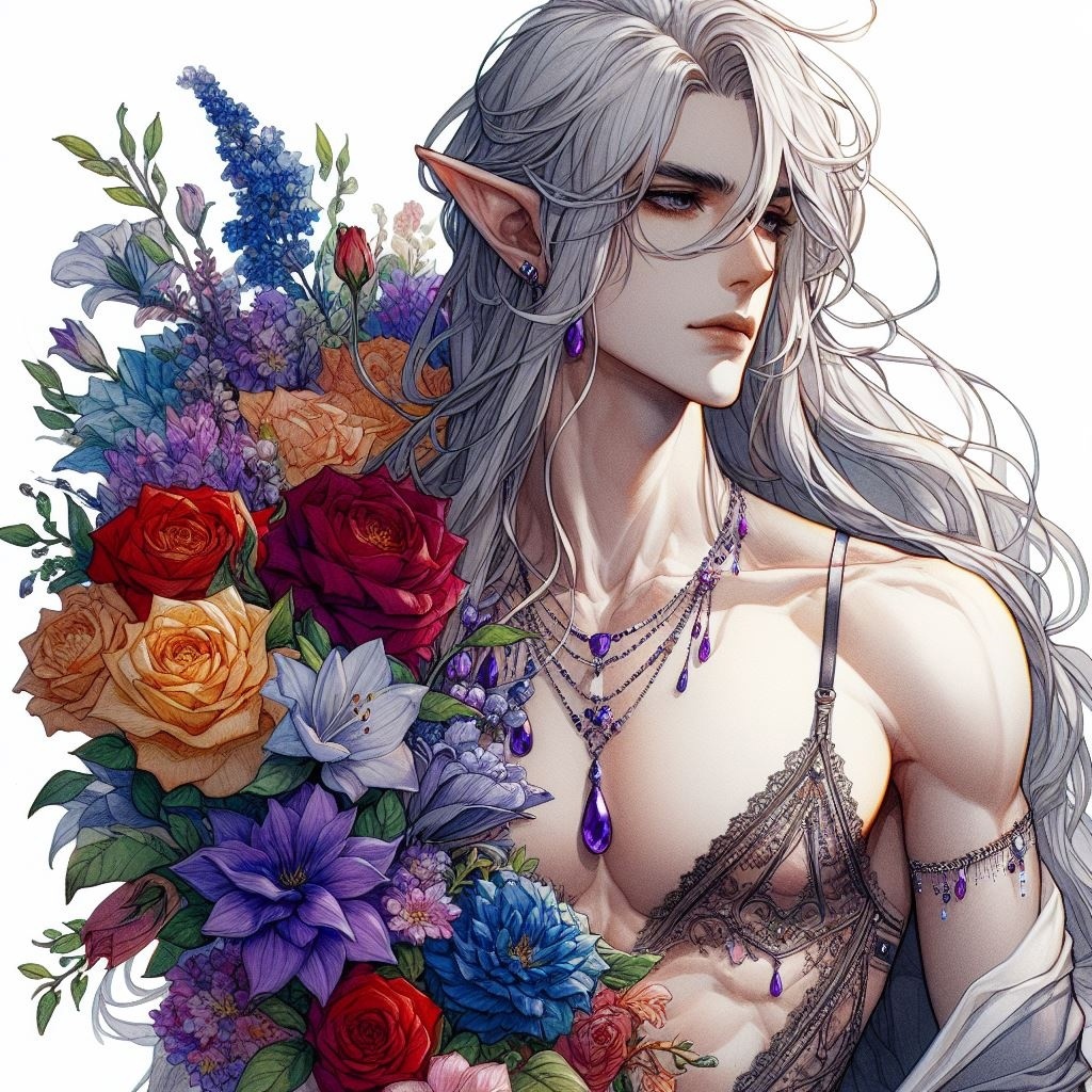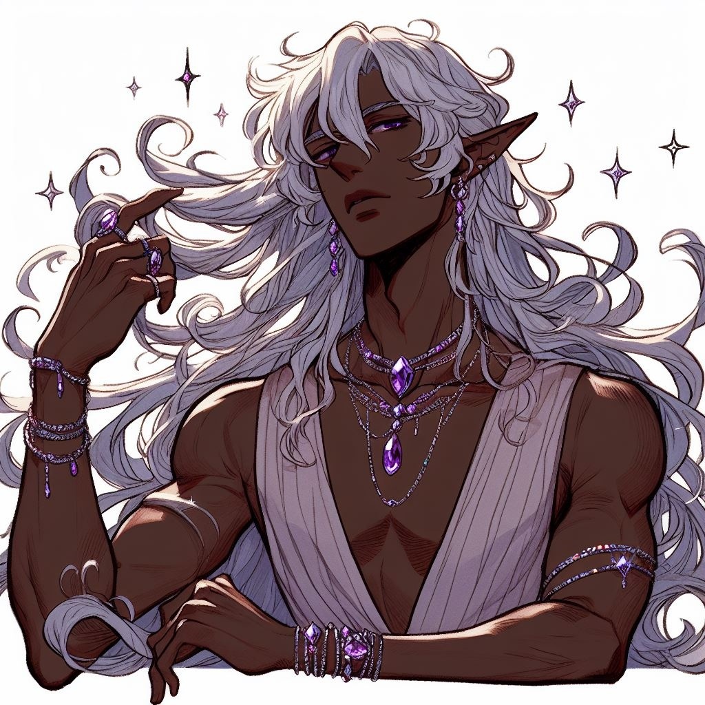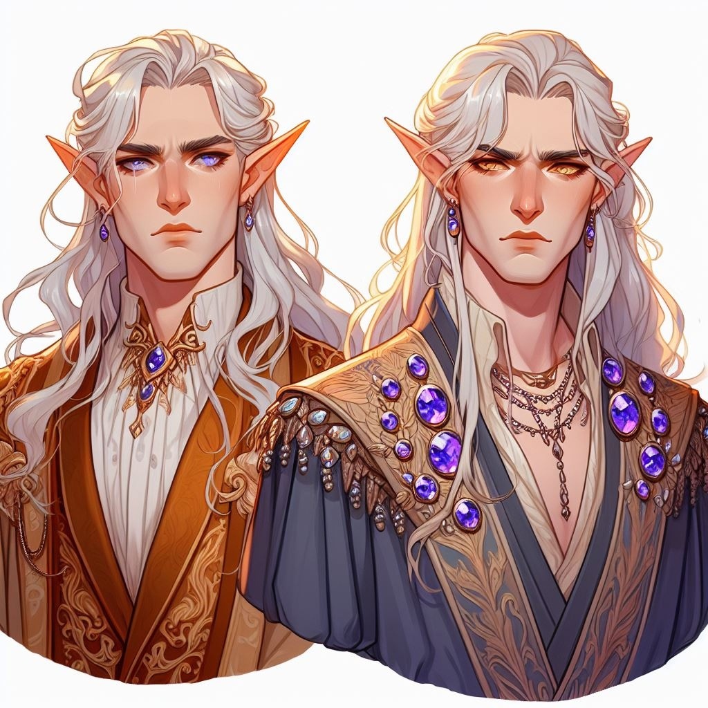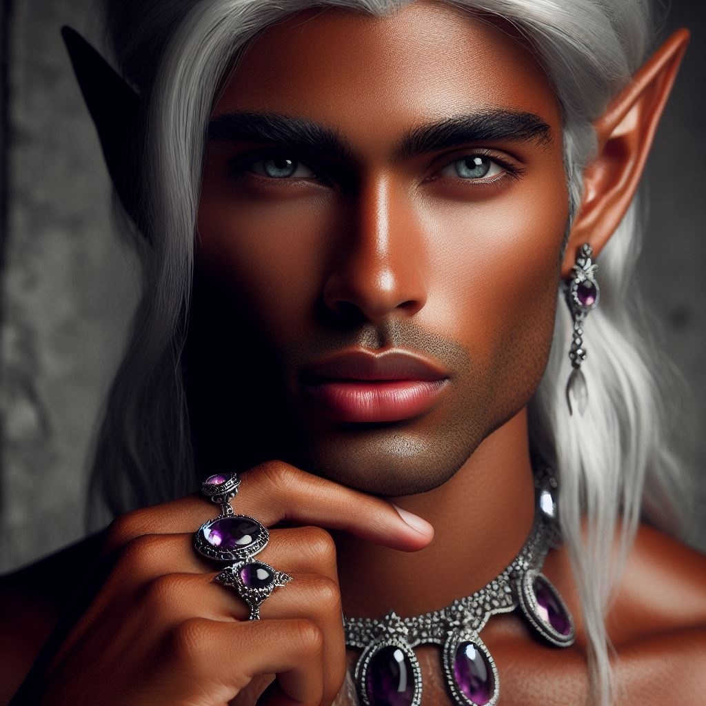 парень, эльф, серебристые длинные волосы, бледная кожа, роскошный камзол, украшения, аметисты, ракурс сверху