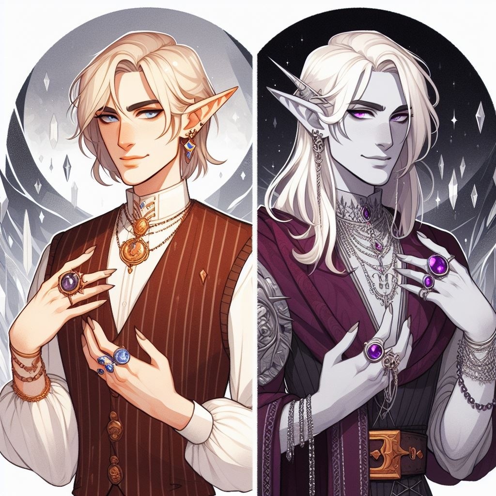А вообще в книге было два эльфа, у одного волосы серебристые, у другого в золотым оттенком, но Бинг чаще всего их как-то по отдельности рисует, просто два портрета рядом