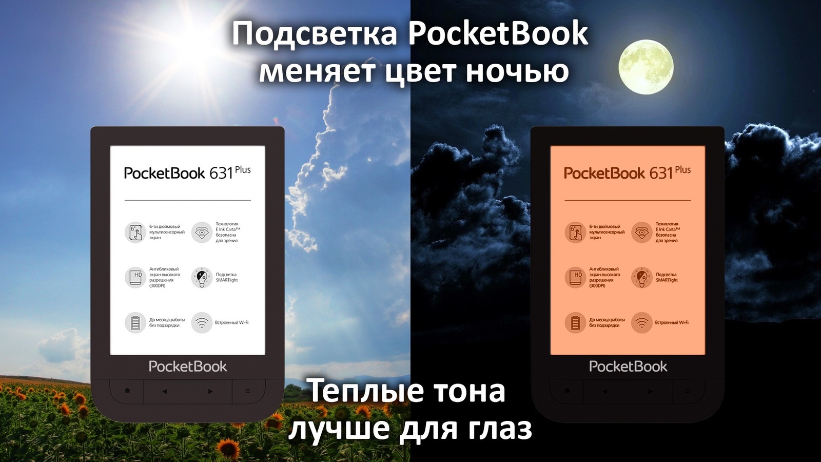 Вторая модель —PocketBook 631 Plus: его подсветку можно регулировать буквально под настроение и время суток. Днем – прохладный голубой оттенок, ночью – теплый желтоватый. Такое регулирование подсветки облегчает чтение и не напрягает глаза. Да еще и убаюкивает на ночь ☺