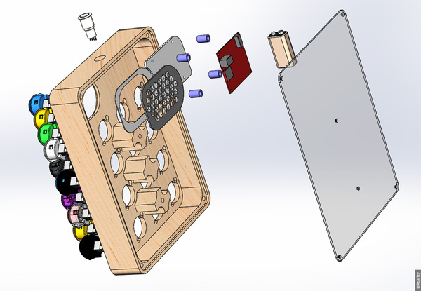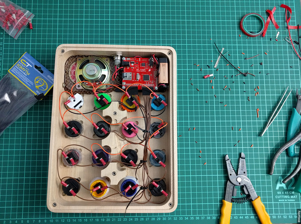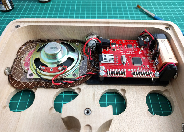 Собираем всю электронную начинку. Припаиваем пины, разъёмы и кнопки. Основной элемент питания — обычная 9в «Крона». Её хватает примерно на 10 часов гудежа. Все сэмплы кодируются специальным образом и записываются на SD карту. Отдельно собирается конфиг, который описывает логику работы для каждой кнопки.