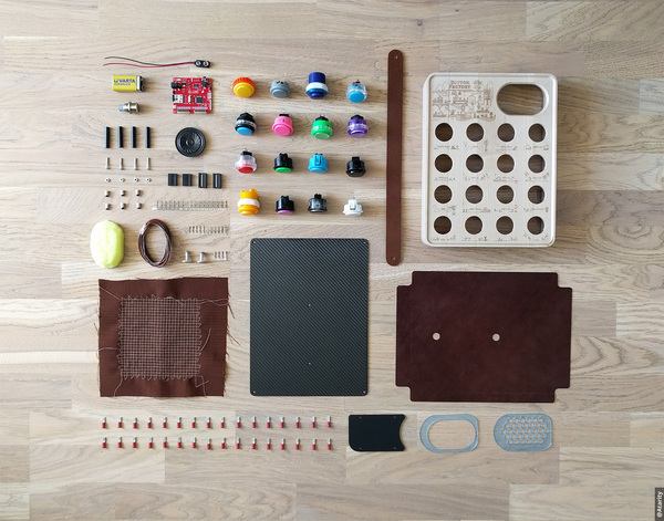 Все детали перед сборкой. Кусок замши для крышки, кожаная ручка, клеммники, ткань для гриля. Все винты кастомные. Чтобы никого не обманывать: сборка устройства заняла у меня два выходных дня. Но для того чтобы подготовить все детали на этой фотографии у меня ушёл почти год, половину из которого я провёл в командировках по работе. Так что многие детали были привезены из совершенно разных ебеней, хотя я спокойно мог купить их в ларьке рядом со своим домом.