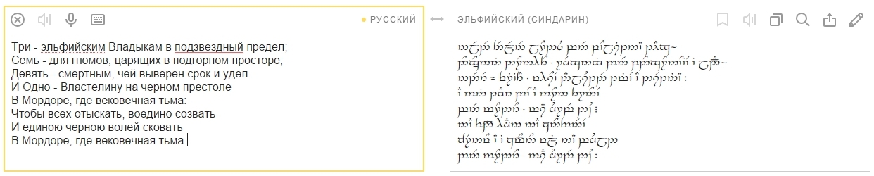 9 jogray Ко дню рождения Джона Толкина Яндекс запилил переводчик на эльфийский! 9 лет назад Баянометр молчал! Толкин Яндекс Эльфийский язык День рождения