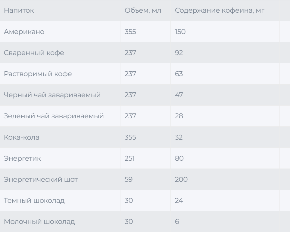 Регистр лекарственных средств России считает допустимой дозу в 300 мг вещества на взрослого человека, это эквивалент 4 чашек по 150 мл натурального кофе. Департамент сельского хозяйства США предлагает ориентироваться на следующие показатели содержания кофеина в напитках: