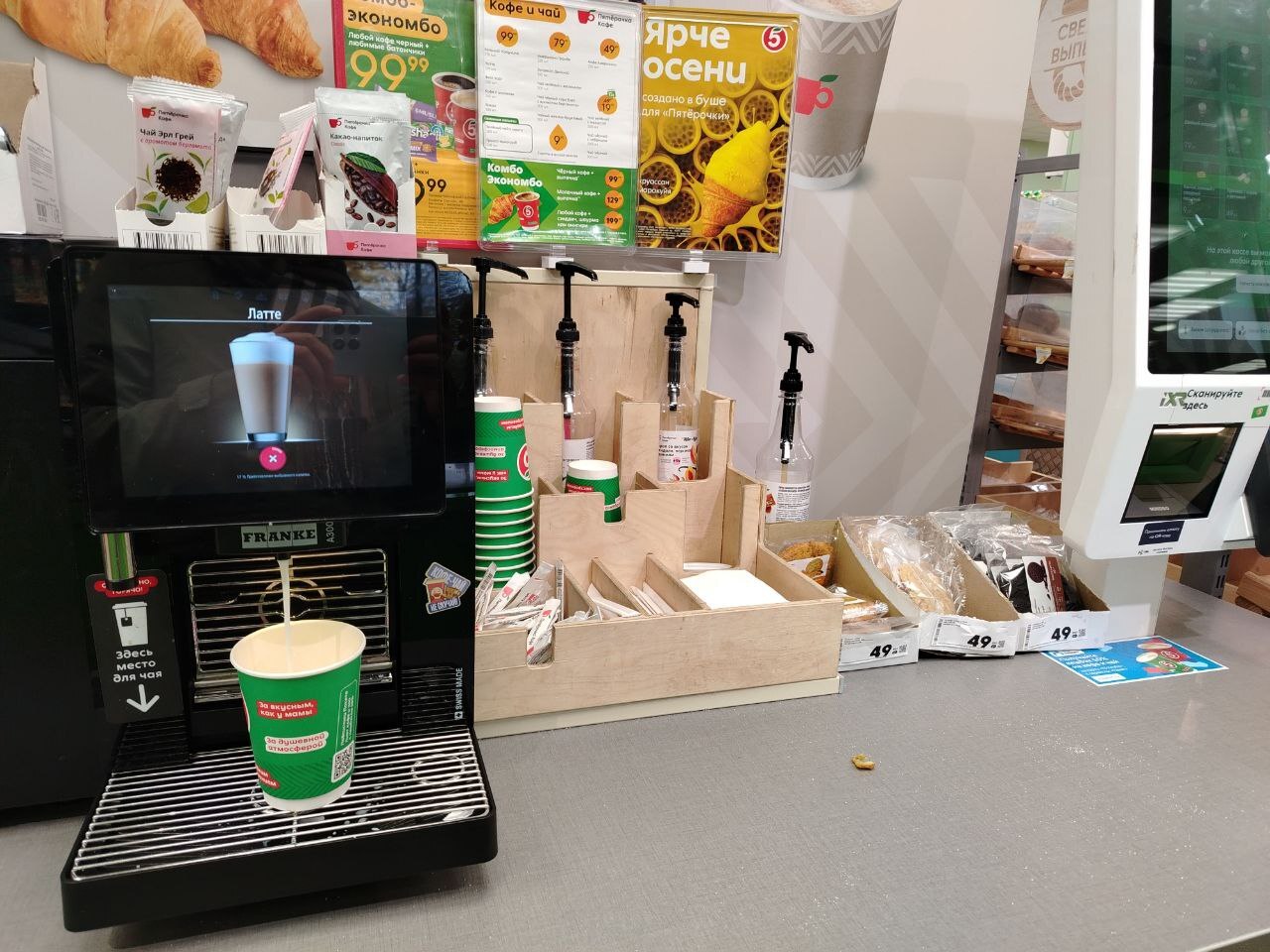 Зашел на прогулке в Пятерочку, обошел зал и не увидел кофейный аппарат! Удивился, решил написать об этом пост. Потом спросил работника, есть ли кофеаппарат. Та указала на него. Супер, сделал себе латте.
