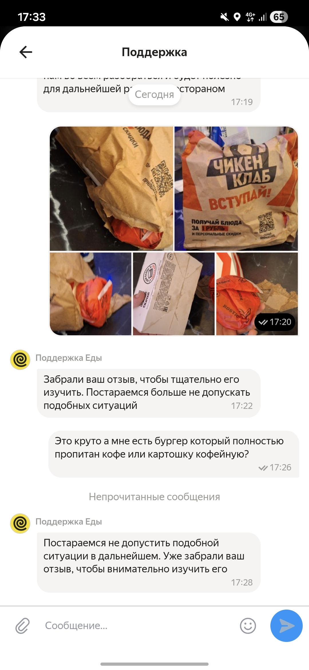 Заказал покушать к пиву, в свой единственный выходной, увы пришлось пить пиво ибо хрючево привезли залитым кофем(который я не заказывал). Поддержка фигачит стандартные ответы.