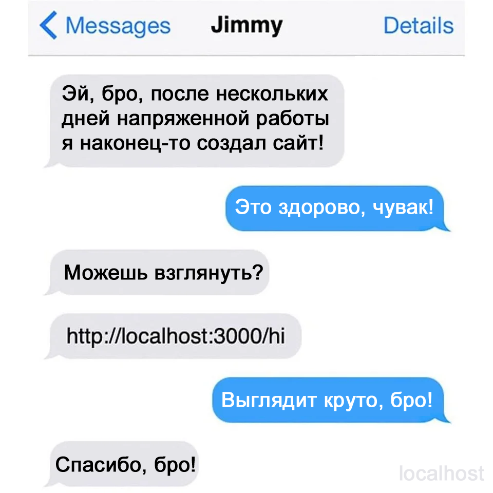 184 stavropol IT-юмор Когда бро запилил свой первый сайт 5 лет назад Пояснительная бригада докладывает: localhost - это локальный сервер, т.е. в качестве сервера используется твой же компьютер. Взято отсюда Localhost Создание сайта Переписка IT юмор Ещё 0
