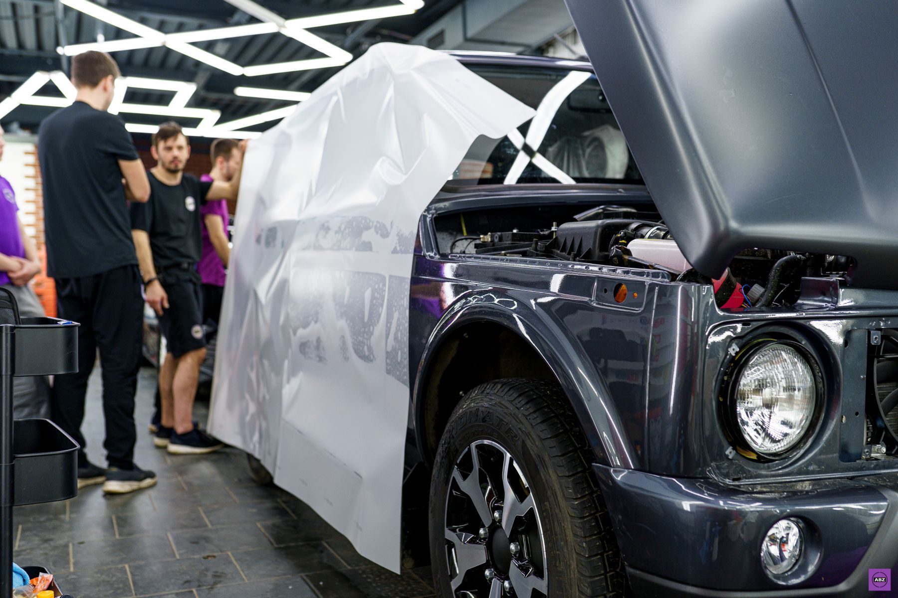 Всю процедуру она перенесла стойко: разбор, подготовка, полное оклеивание матовой полиуретановой плёнкой. Всё по высшему разряду, как будто это не Лада 4x4, а, прости Господи, Range Rover. Кстати, на этапе разбора кто-то в боксе пошутил, что это «урбан-стелс-версия» — потому что выглядела она уже как спецтранспорт для миссий в центре мегаполиса. Без регистрации и SMS.
