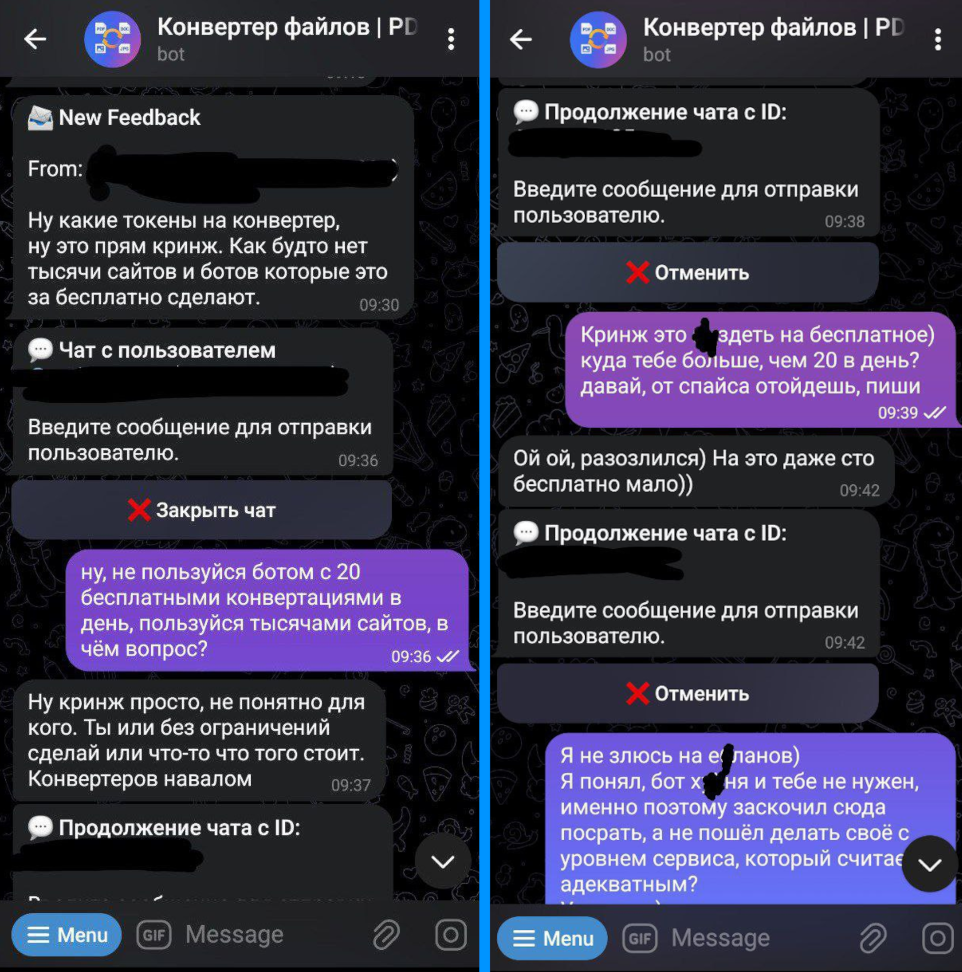В целом я думал меня сложно удивить, но на днях я сделал бота в тг для конвертации файлов и помимо основного, там есть возможность дать фидбэк, ну дескать чтоб люди писали о проблемах, говорили чего ещё надо и тд.
