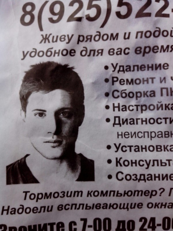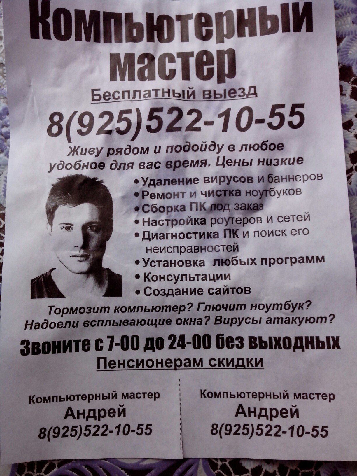 У нас такой-же "Андрей" все вокруг обклеил, что смешно - от руки написанными объявами. Причем не шрифт рукописный, а реально от руки, причем довольно коряво. На что надеется?
