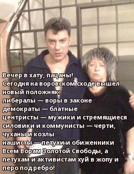 Попробуйте расширить свое мировоззрение, в стране кроме поганых нашистов и праведных революцьёнеров, есть еще 140млн человек у которых имеется свое мнение. Самое смешное, что против путина выступают бывшие губернаторы, депутаты, министры, диссидентюки, которых не взяли в едро и все это с благословения горби. Ругатели путина, хоть что-нибудь конструктивное скажите, предложите альтернативу, которая удовлетворит все население, а не только криатиффный класс.