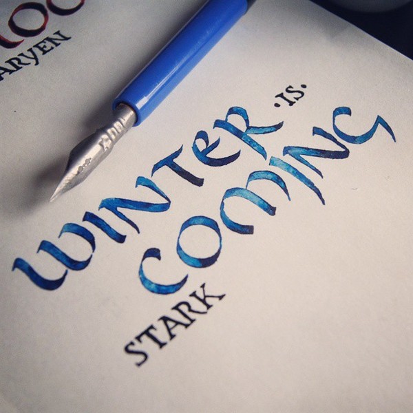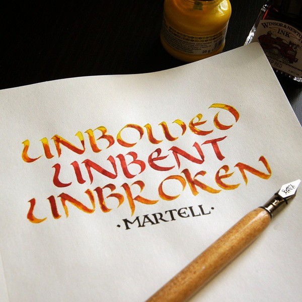 Хочу поделиться подборкой своих работ, посвященной девизам великих домов Вестероса из Игры Престолов(апрель, 2015). Все работы выполнены унциалом, цвета к каждому девизу подобраны с учетом цветов гербов. Унциал очень красивый, мягкий и пластичный стиль письма. Часто его называют "шрифтом из Властелина колец". Но на самом деле он был распространен в 3-7 веках. Данный вид письма считается одним из первых стилей заточенным под ширококонечное перо.