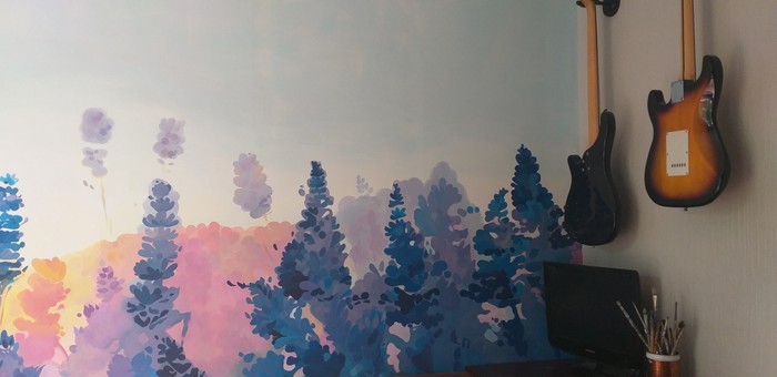 651 karkysha13 5 лет назад Когда хочется больше ярких красок в обычной жизни! Надоели обои и решила внести ярких красок в обычную жизнь. Теперь просыпаться по утрам столо чуть приятнее)) Выручали меня водоэмульсионные краски и колоранты.Рисунок мой, да комната моя) [моё] Роспись стен Рисунок Творчество Комната Вдохновение Ещё 0