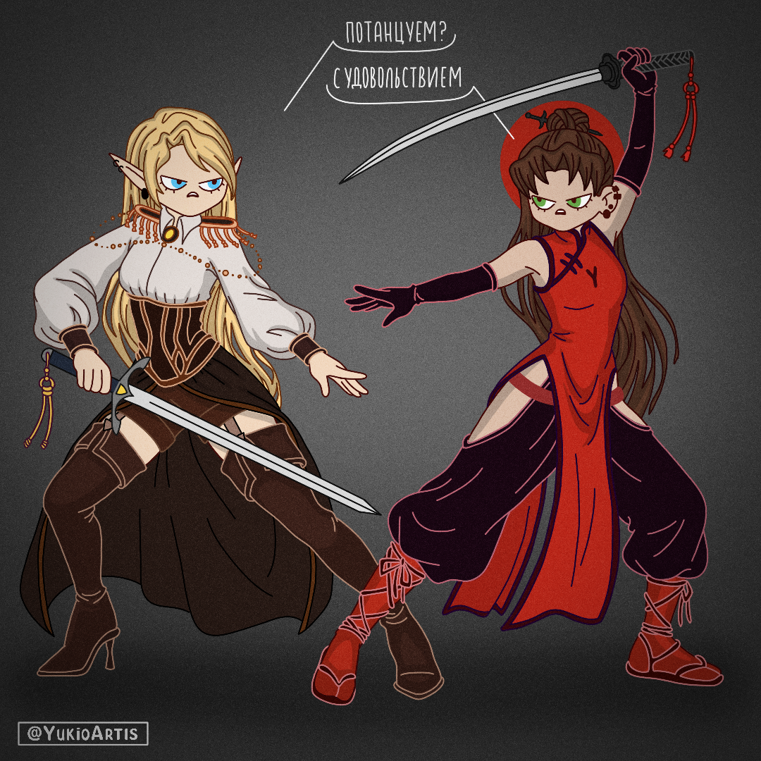 Здесь нужно было изобразить противостояние свой персонаж vs персонаж другого художника. Как видите, у Юкио случился апгрейд и появилась катана. Прада так топилась, что в отправленной версии про "О" забыла, пришлось добавить после :(