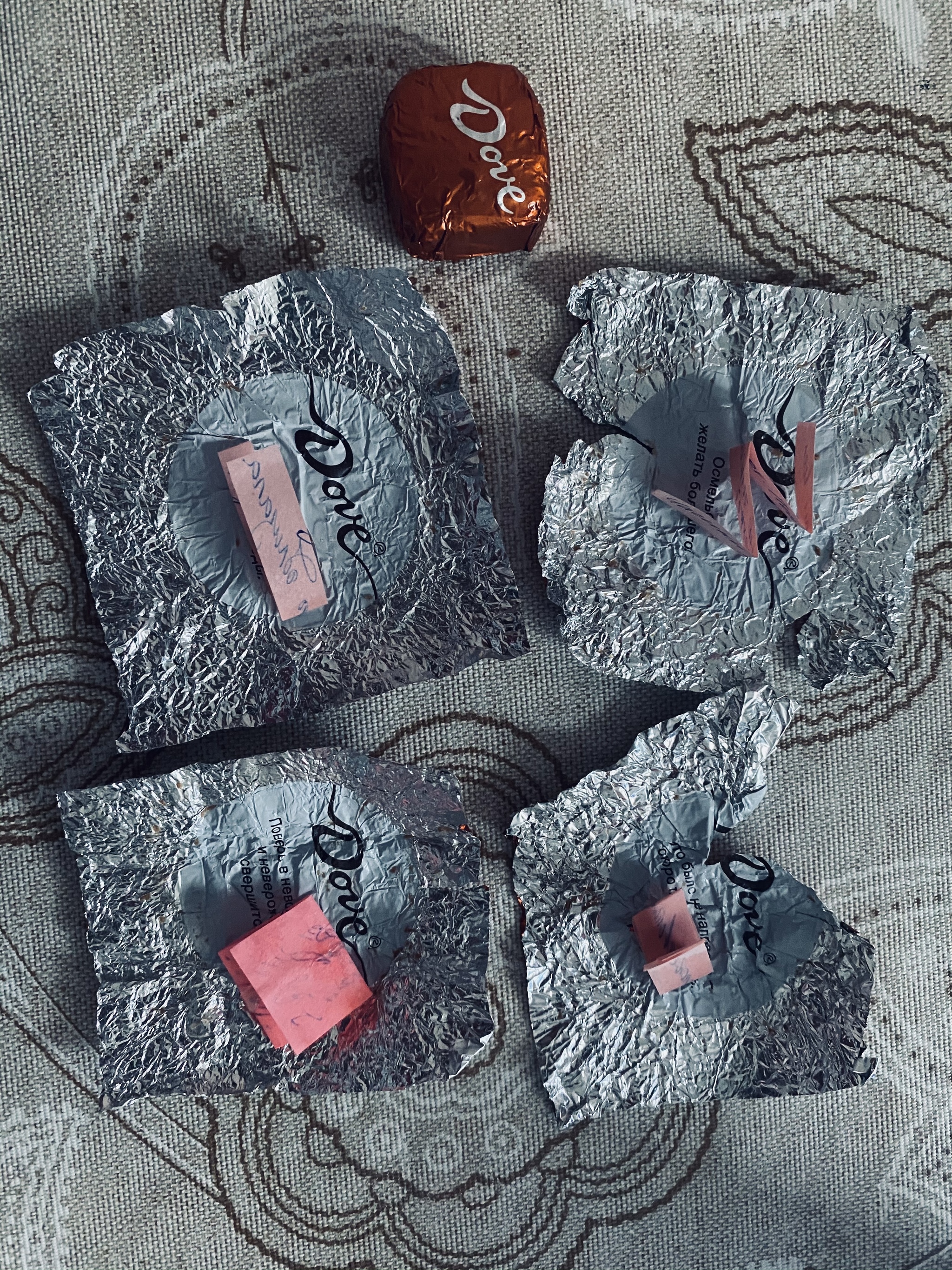 Сестра подарила мне на Новый год коробку конфет Dove, но не обычную, а с милыми рукописными пожеланиями внутри. То есть ребёнок придумывал пожелания, писал на бумажке, разворачивал каждую конфетку и заворачивал заново. Милота.