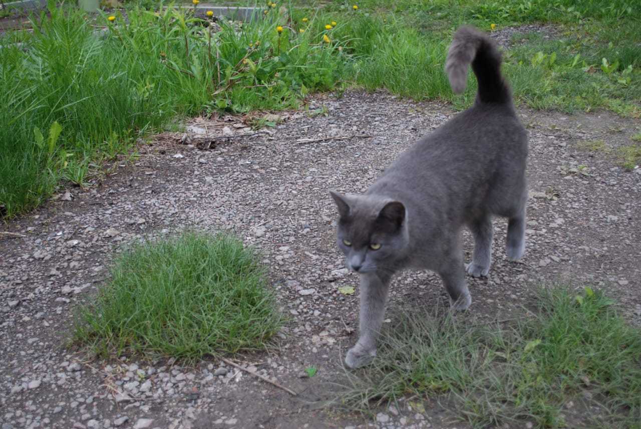 Немыслимо крохотный, тощий котенок серо-голубого окраса. Глазки уже были открыты, но он был таким маленьким, что казался новорожденным. Страшно было держать его в руках. На нем кишели блохи, он весь был коричневый от запекшейся крови. Мне казалось он умрет просто у меня на руках.