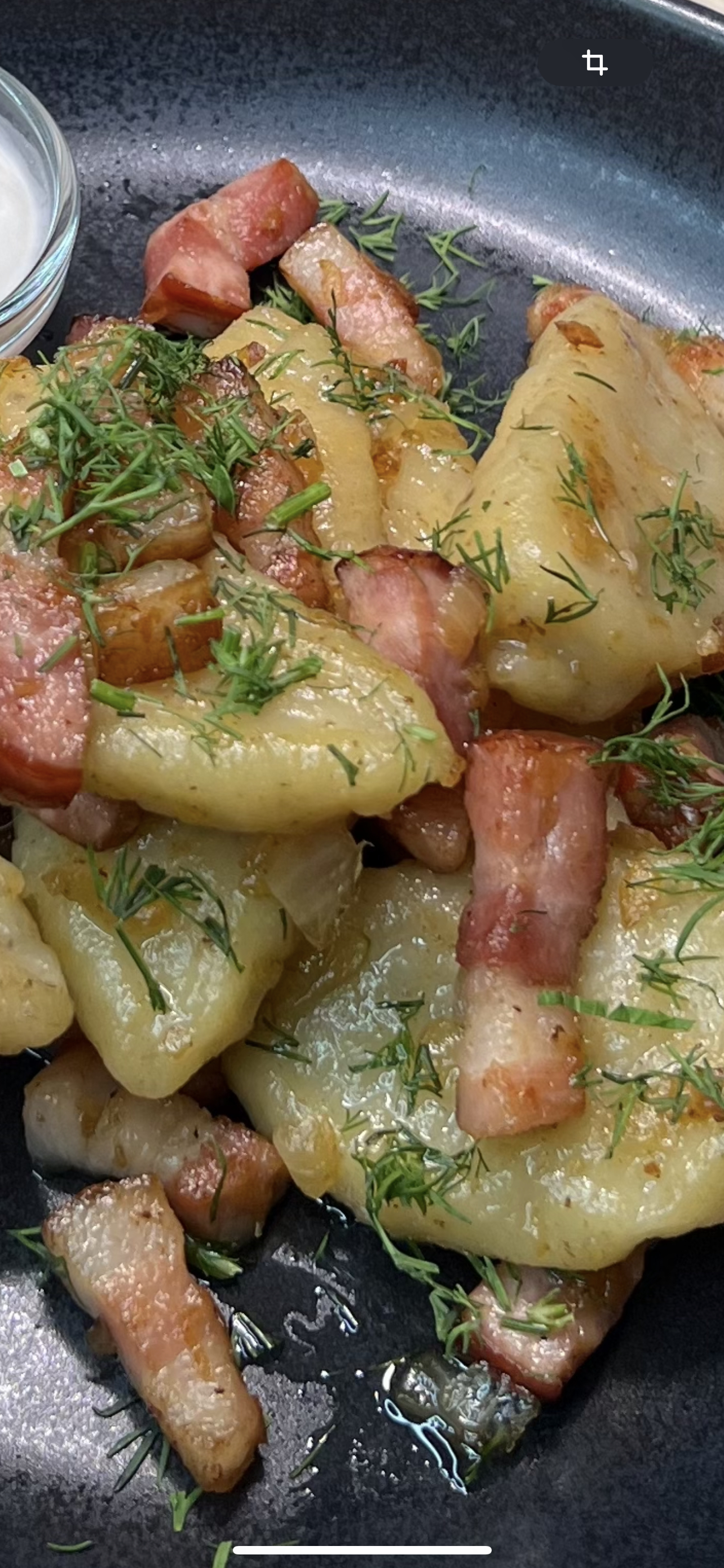 У меня это поджаренная копченая грудинка с луком и чесноком и грибы обжаренные в сливочном масле с луком. Приятного ❤️