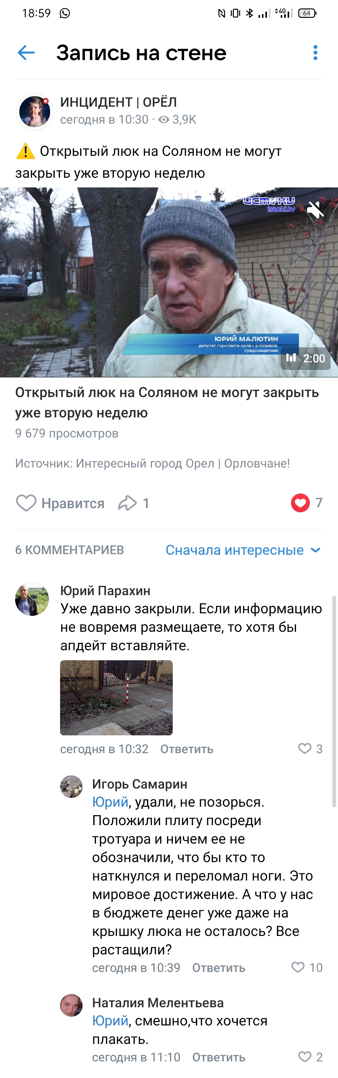 В ВК выложили пост с репортажем о проблеме открыто люка. Мэр города Орла решил обновить свою репутацию в комментариях.