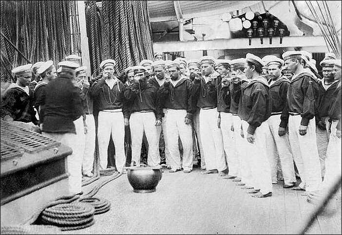 На снимке Лаутенслагер ещё не знает, что его ждёт, а моё внимание привлёк тянущийся к козырьку левой рукой моряк справа. Приглядевшись, я понял, что в правой он держит боцманскую дудку.