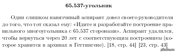 Имеется апокрифическая байка о том, как сверхстарательному аспиранту было предложено построить в своей диссертации 65 537-угольник, после чего тот появился вновь лишь двадцать лет спустя. Реальность почти столь же курьезна: Ж. Эрмес из Лингенского университета посвятил этой задаче десять лет, закончив ее в 1894 году; его неопубликованная работа хранится в Геттингенском университете. К сожалению, Джон Хортон Конуэй — быть может, единственный из математиков нашего времени, когда-либо взглянувший на эти документы, — сомневается, что там все верно.