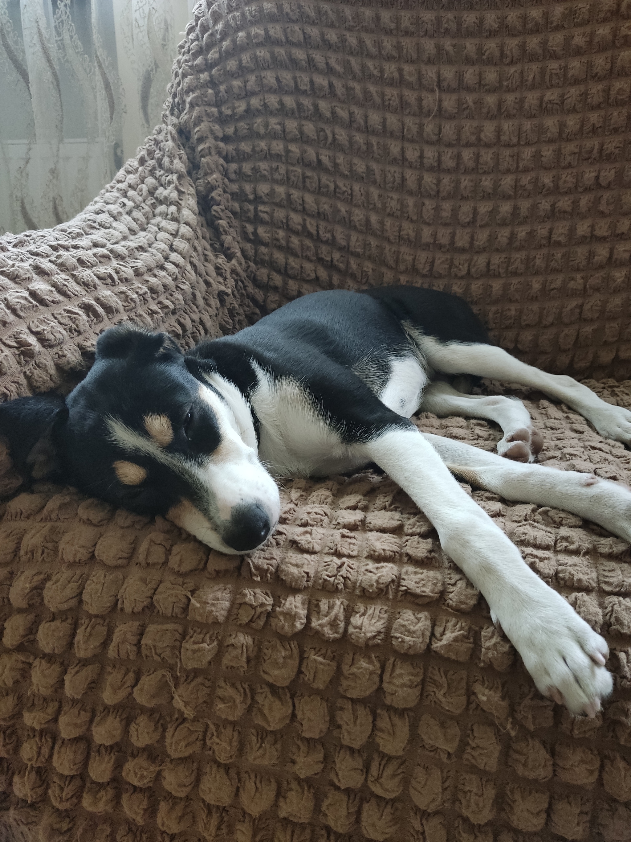 Прибежало это чудо само, встало на пороге дома и никуда не ушло. Сейчас уже подросла, когда возили в ветеринарную клинику сказали 3 месяца ей. Вот уже почти 2 как живёт с нами. Дети в восторге. По окрасу и морде прикольная метиска наверное) хотя когда поменьше была думали породистая.
