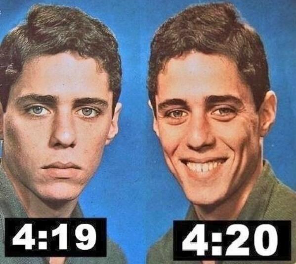 я ещё где то слышал, что так покупают каннабис. мол подходишь к торгашу и спрашиваешь сколько времени. он тебе 4:20.