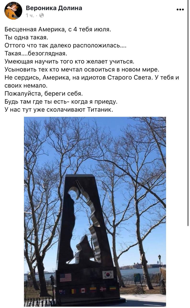 ну взрослый же блядь человек. С образованием там всяким наверняка. Откуда такое холопское "Бесценная Америка"? Многоточия эти плебейские, "идиоты старого света" это , видимо, мы ) Уезжайте , Вероника.