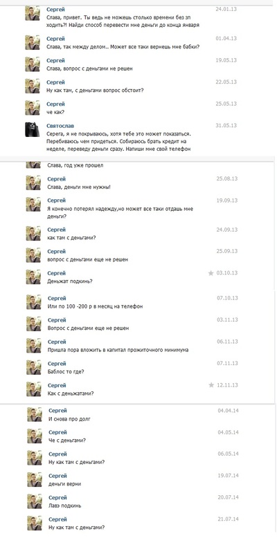 Дал другу для его "дела" 950грн это прошлой зимой было 100$ обещал за две недели вернуть 1200... В итоге, ничего не вернул, пропал, потом попал в больницу. Я ждал, потом опять пропал, потом неделю сука до терминала пополнения шел, КОТОРЫЙ под домом, все время не успевал. Потом отдал мне часть 500грн, а остальные 700 сказал, что не хочет будить мать в 3 ночи, отдаст с утра. Не отдал, неделю на звонки не отвечал. Потом опять пропал, потом долго копил деньги, собрал - опять закинуть не мог, поехал на дачу бухал ( а гуляет он дай боже с размахом и каждый день) на даче якобы забыл паспорт и кошелек, оставили на даче велик за 15к закрыли дачу. Вернулись за великом - велик есть , кошелька нету, удивительно сука! Потом оказалось что паспорт он не терял, а терял другой друг - когда он мне говорил, что друга этого на даче и не было. Зачем вез на дачу столько денег? - Хотел отдать. - Ты ж даже меня не позвал? - Ну хз...я думал ты придешиь. - Ты ответил на 13 звонок в 11 вечера, куда я поеду? - Надо было бы приехал. Опять пропал. Выяснилось что моих денег у него а снимал он с кредитки, те бабки что проебал. Снять снова не мог - мама карту забрала ( в 20 сука лет мама карту забрала стипендиальную или какую там). Ждем, ждем - обещает отдать с денег на море. Нихуя не отдал поехал на море, поехал еще потусил, потусил кароч. Лето - не одного звонка, попытки отдать деньги - я не могу, пока нету, как только так сразу, мама ключи забрала а свои я даче потерял - Чувак два месяца прошло, ты не можешь дубликат сделать? - Ну.... Конец лета, говорит что якобы пахал на стройке, дадут зарплату отдаст. Зарплату якобы не дали, а точней задержали, а он за ней по космическим причинам сходить не может. Поехал учится в Киев, там где и я - ни разу не пересеклись, денег нету. Со стипендии не вариант - как же без пивка вечером. Уже 10 ебаный месяц нету денег, лучше бы я тогда купил по 8,15 доллар и сейчас было бы уже 16... Самое плохое, что я физически выбить с него сам не могу, есть люди которые решают но как-то я не последняя сука. Звонить его родней - тоже херня дело. Чувак просто проигнорил. Самое обидное, что в прошлом году я ему тоже занял на мелкую херь 300 грн с точным сроком возврата - динамил 3 недели. Пока я не приехал домой, не позвонил на что он ответил что он не дома. Я пошел, позвонил в домофон он открыл дал карту, сказал снять. А ну да, встретил летом одного его бывшего друга, который поведал что он висит по городу тоже не мало и люди так же ждут. Вот вам и лучшие друзья, и вся хуйня... Вывод - давать сколько не жалко, то сколько бы ты отдал просто на благотворительность, давать тогда когда уверен что можешь выбить, а если нет расписочка и все дела. Ну так хоть какая так гарантия, ах и да Никита я знаю ты на меня подписан верни 700грн сволочь, мне зимние носки не за что купить.