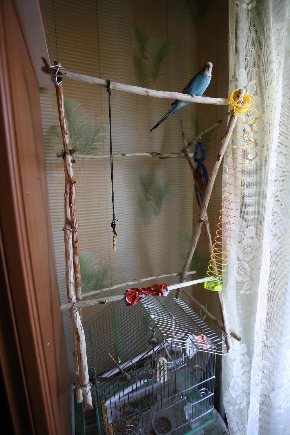 Я знаю, там деревянная есть, где он спит, эти ребристые, от мозолей, а так он в клетке только спит, по сути - снаружи кукует на своем игродроме