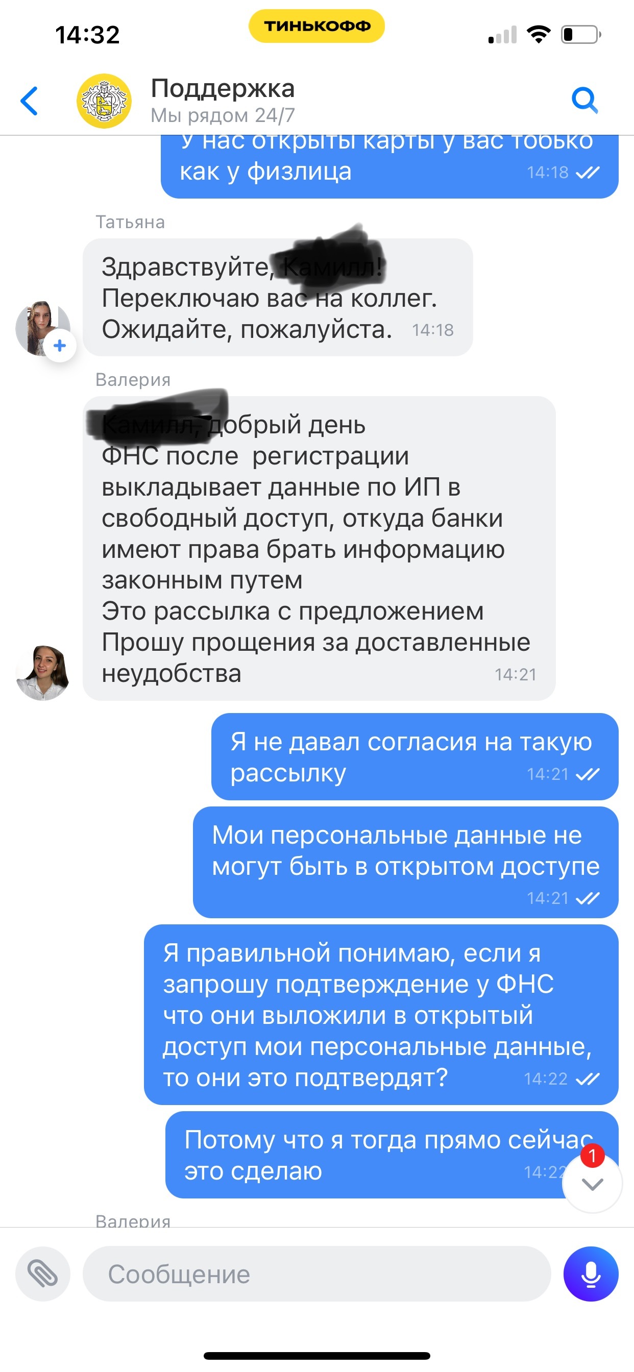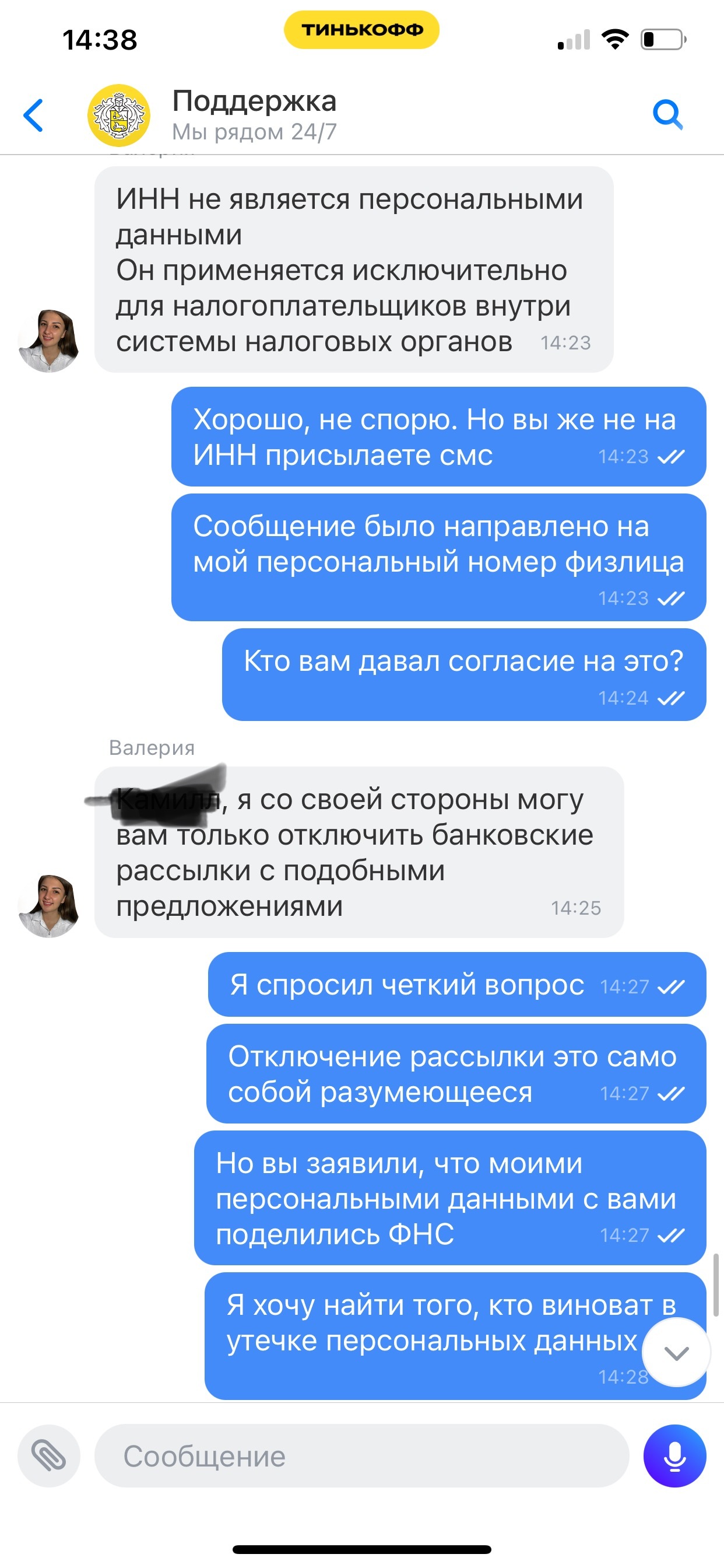 То есть получается @T-bank откровенно признает, что лило ФНС выкладывает персональные данные в открытый доступ, либо одно из двух. Забавно, что после последнего вопрос оператор предпочла закрыть чат)