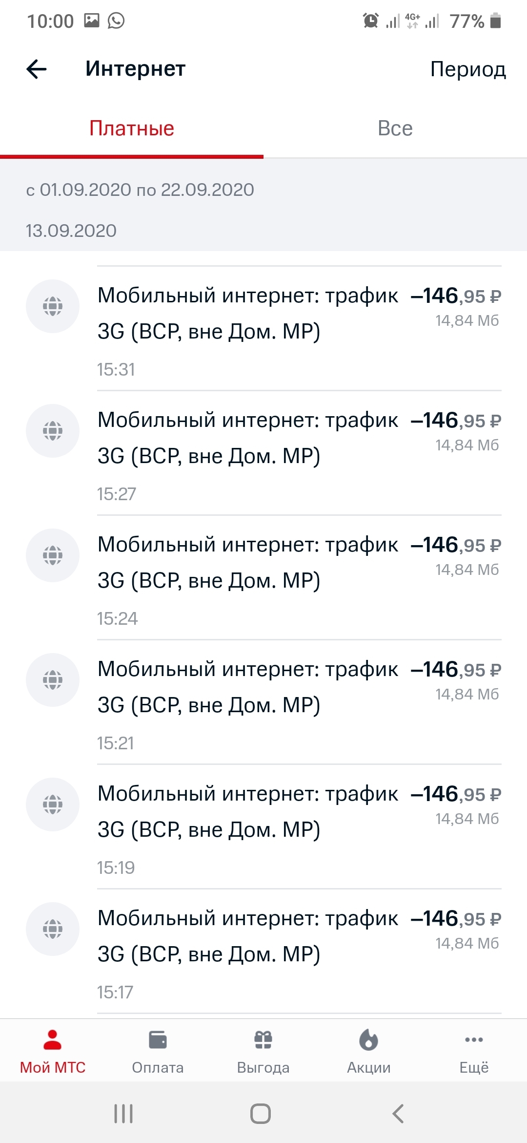 Чуть отступлюсь: есть рабочий телефон и номер МТС. Поехал из СПб в Астраханскую область. Сейчас, после отпуска, в детализации за август, которую мы подписываем на предмет личных переговоров, увидел 90р за интернет в Карелии и решил посмотреть, что покажет личный кабинет на текущий момент...