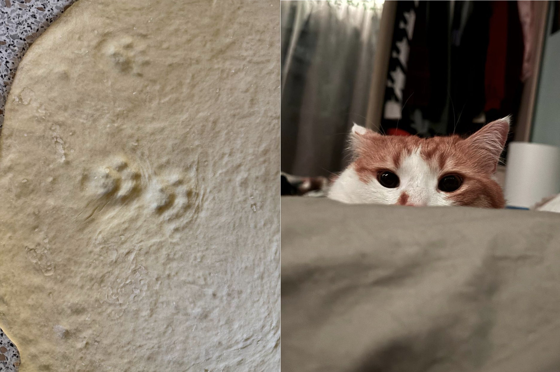 Тесто было накрыто полотенцем. Жаль, планировали рулет - лапки, как узор, оставить не удалось на выпечке...