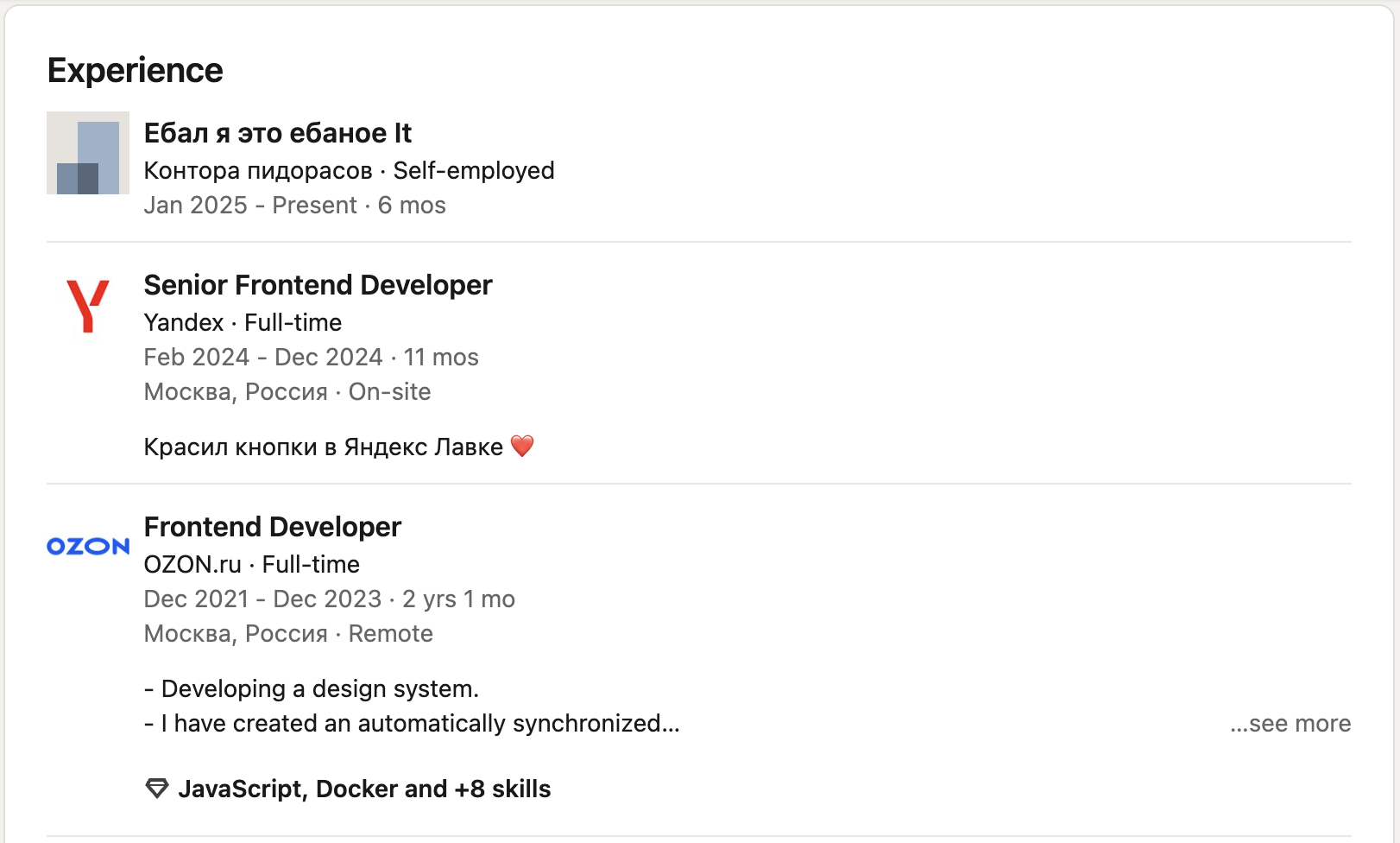 5 JeremyQ 5 месяцев назад Когда познал вкус IT Публикую с согласия автора, так что "моё") [моё] Картинка с текстом IT юмор LinkedIn Карьера Айтишники Мат 1 Ещё 0