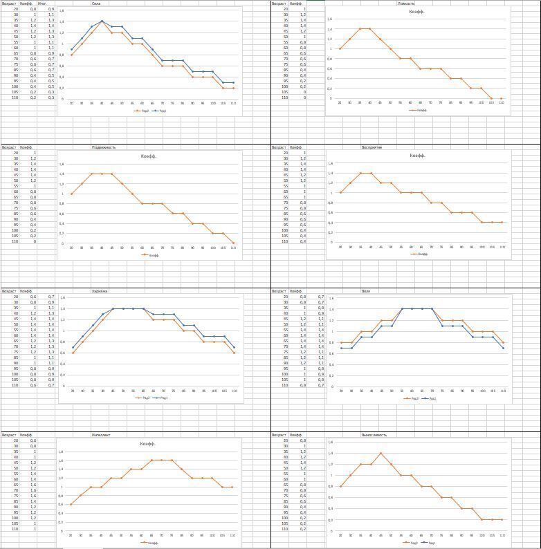 З.Ы. Надеюсь никто больше не будет делать такие таблицы. Каждая для представителя расы или народа. Фишка тут не штрафы за возраст, а фокусировка на группах навыков, основанных на статах в зависимости от возраста персонажа или НПЦ. И соответствующиий коэффициент на группе навыков.