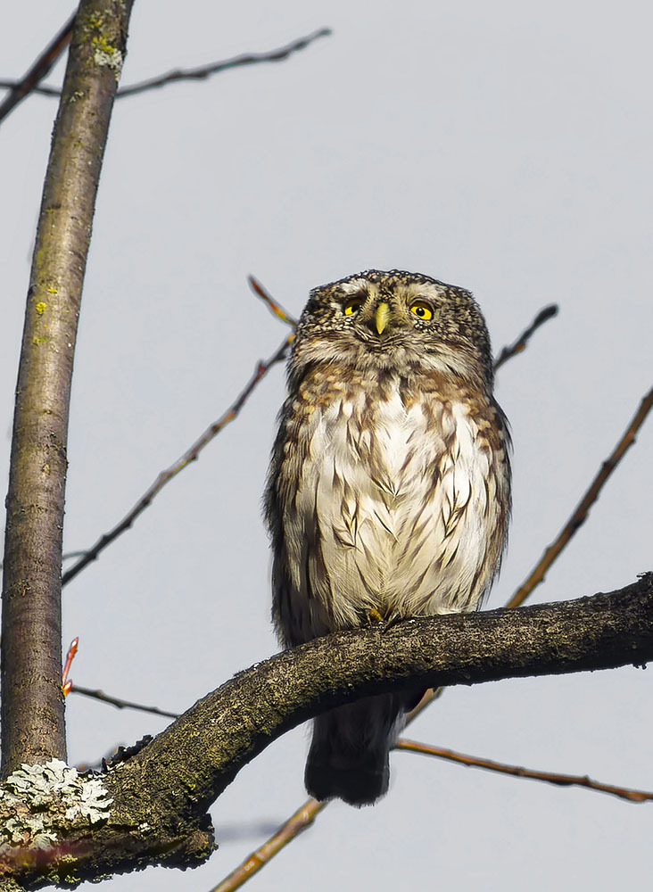 Питается в основном мышами, полёвками, землеройками и мелкими птицами, охотится из засады, чаще в сумерках, но иногда и днём. В дуплах и дуплянках нередко устраивает кладовые из тушек зверьков и птиц. Оседлый вид, молодые птицы в первую осень совершают небольшие кочёвки в поисках постоянных территорий.